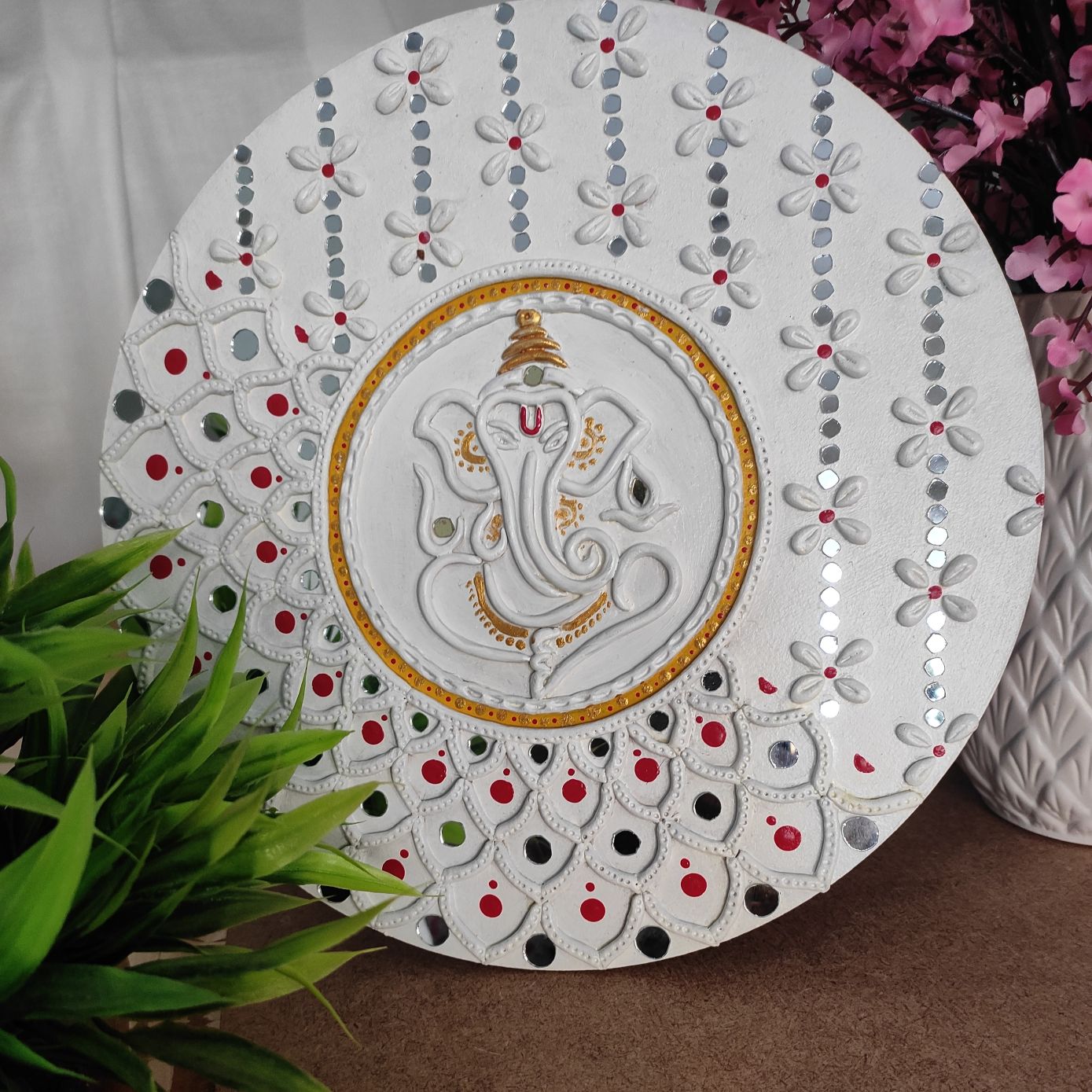 Bring blessings and positivity into your home with this handcrafted Lippan Art wall decor featuring Lord Ganesha at the center. Designed on a textured white base, the artwork showcases a beautifully detailed Ganesha motif highlighted with subtle gold accents and surrounded by intricate floral and geometric patterns.
