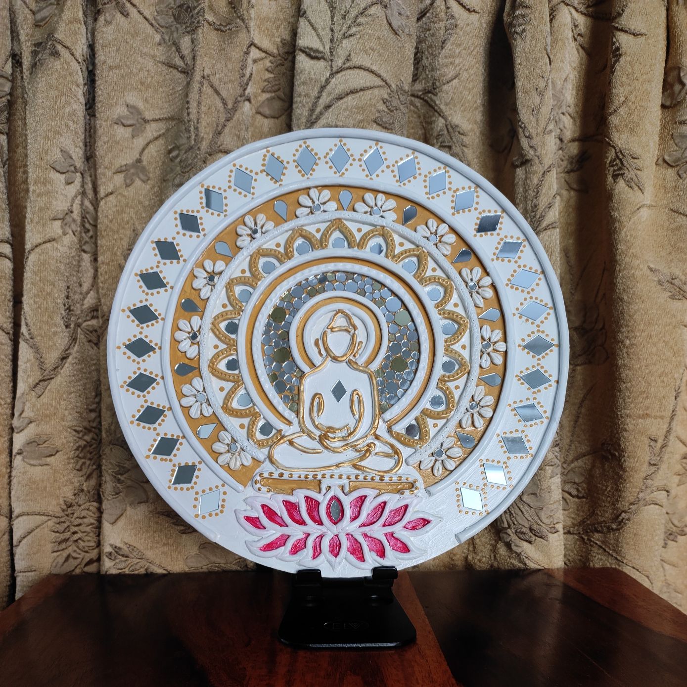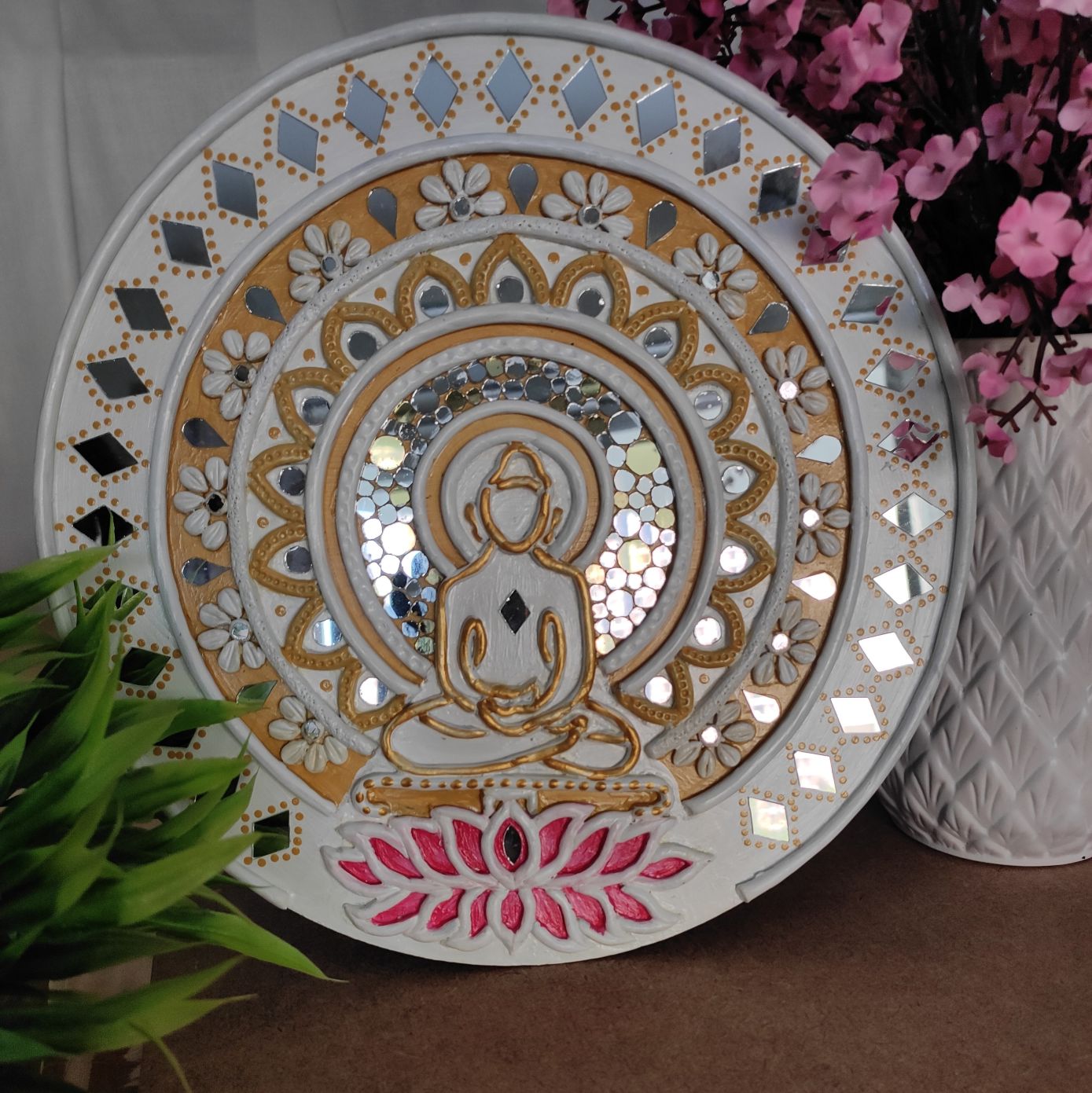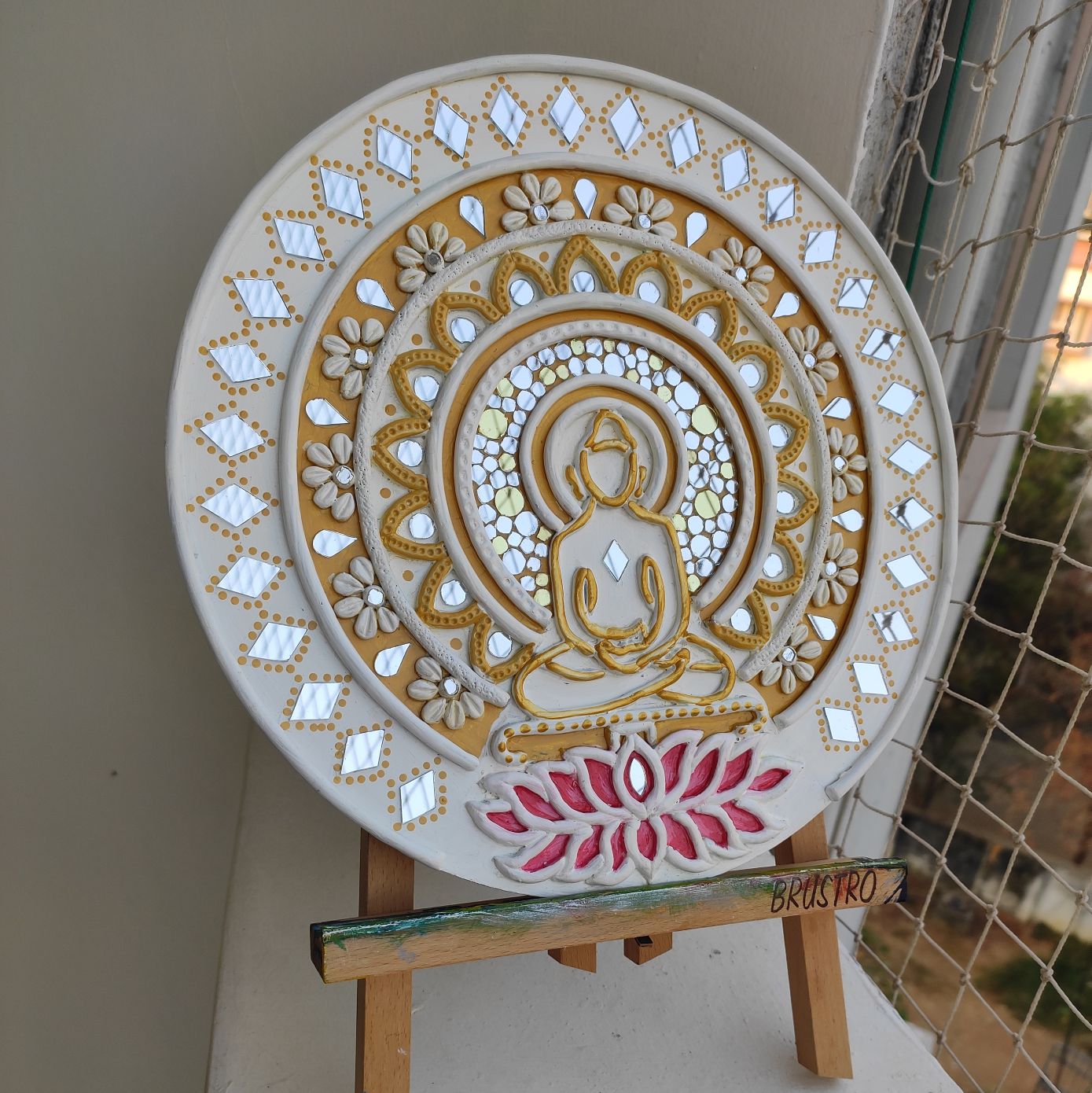 The raised clay detailing highlights fine floral and geometric motifs, creating depth and texture across the circular composition. A red lotus at the base enhances the spiritual symbolism, representing purity and divine awakening. Subtle mirror accents and layered craftsmanship reflect the beauty of traditional mud and mirror art while maintaining a refined and graceful aesthetic.