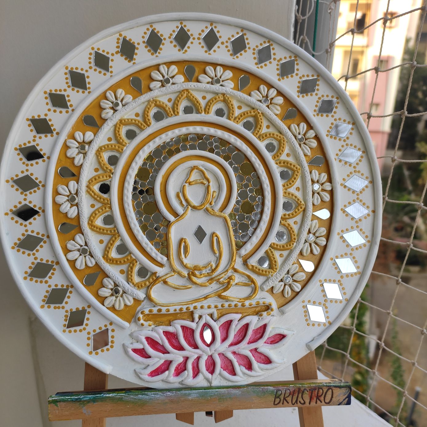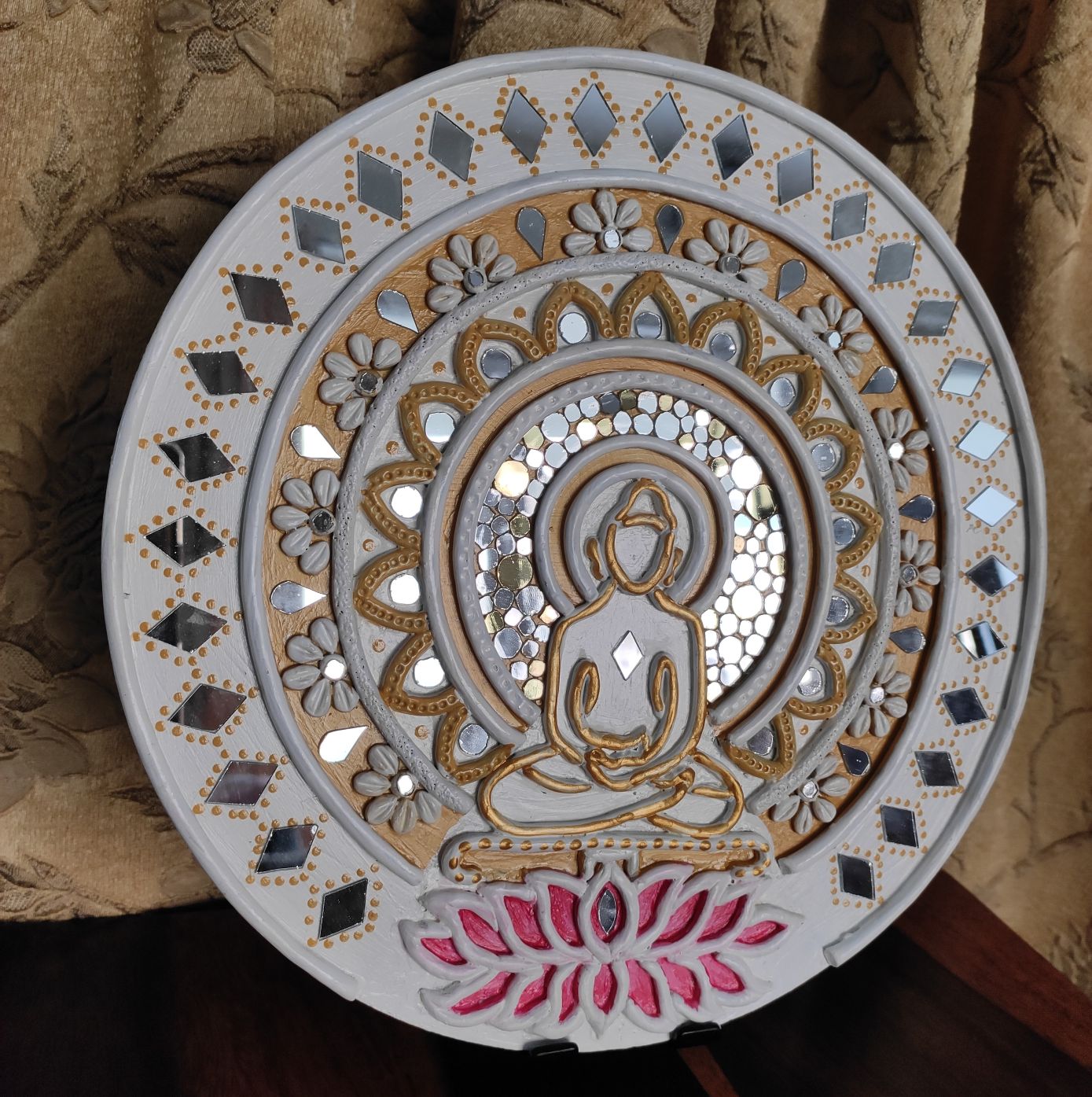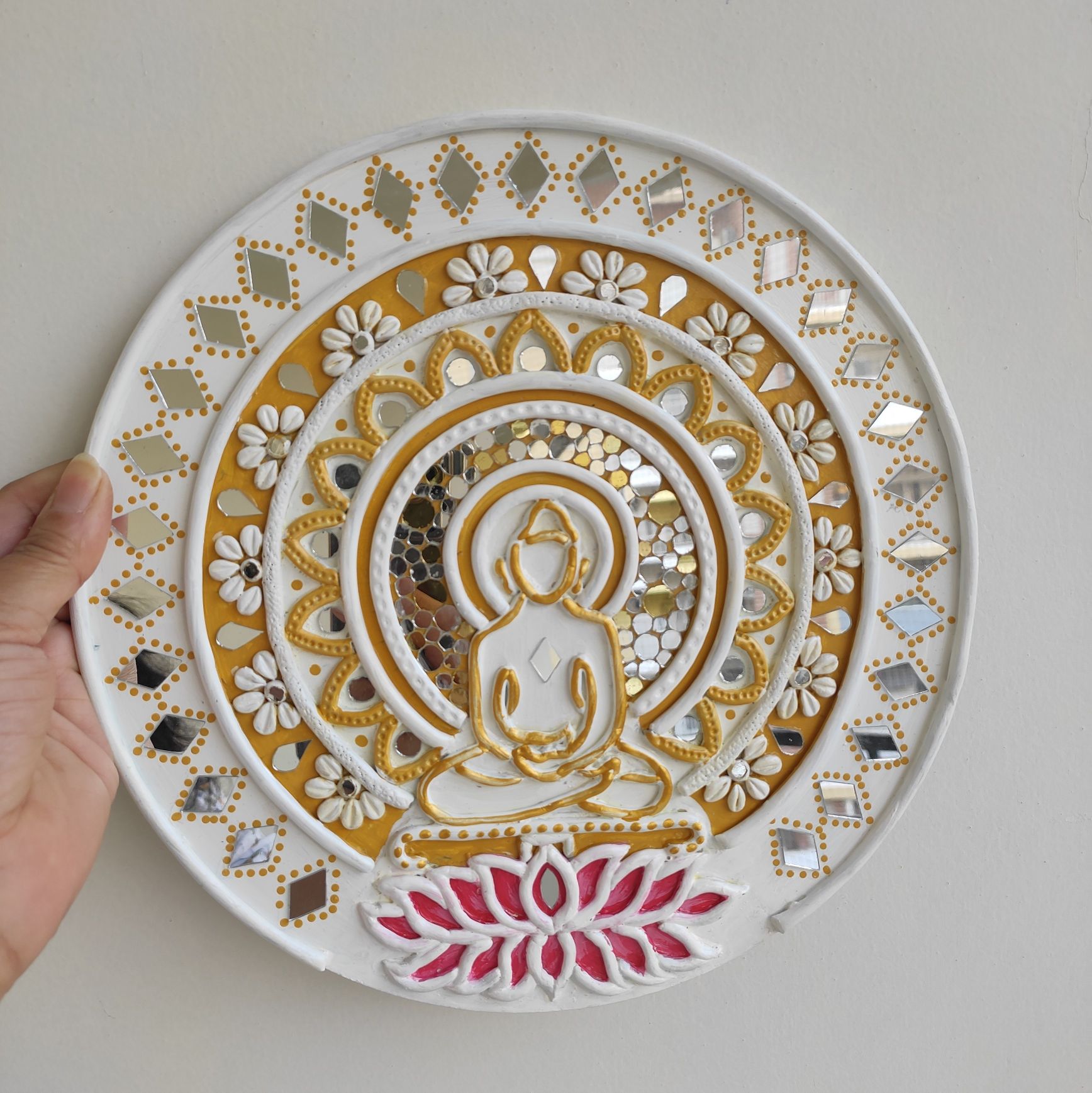 The raised clay detailing highlights fine floral and geometric motifs, creating depth and texture across the circular composition. A red lotus at the base enhances the spiritual symbolism, representing purity and divine awakening. Subtle mirror accents and layered craftsmanship reflect the beauty of traditional mud and mirror art while maintaining a refined and graceful aesthetic.