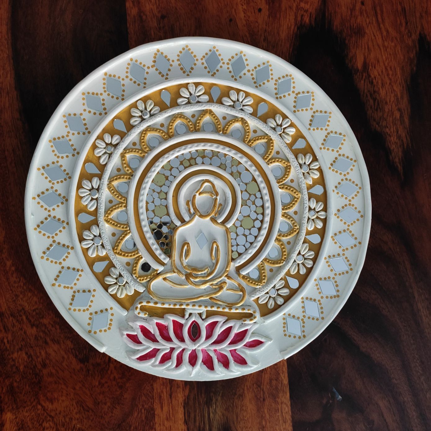 Invite peace, wisdom, and spiritual strength into your space with this handcrafted Lippan Art wall decor featuring Bhagwan Mahaveer at the center. Designed in elegant white and gold tones, the artwork showcases a serene meditative posture surrounded by intricate mandala patterns symbolizing purity, balance, and enlightenment.