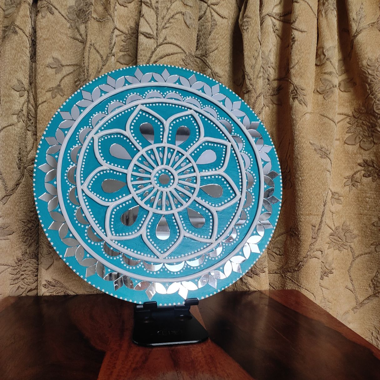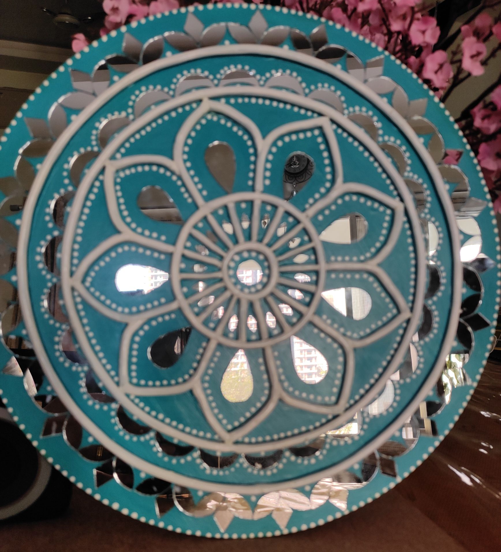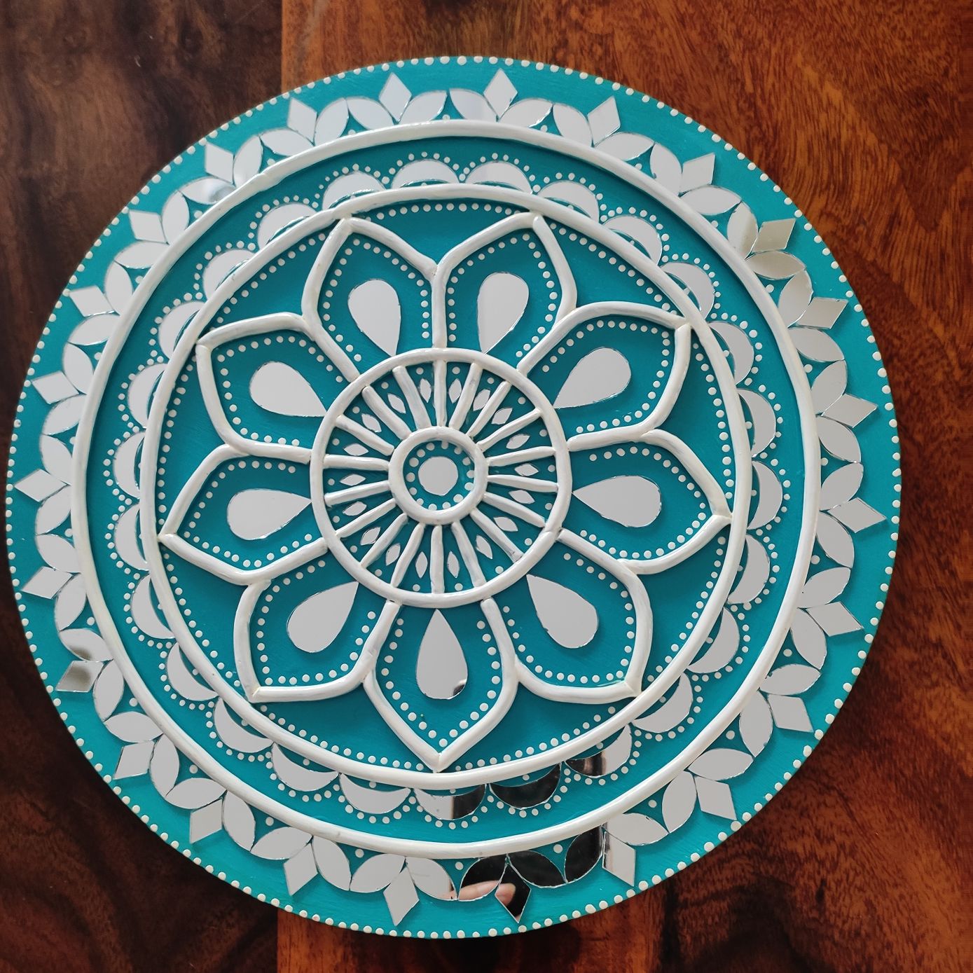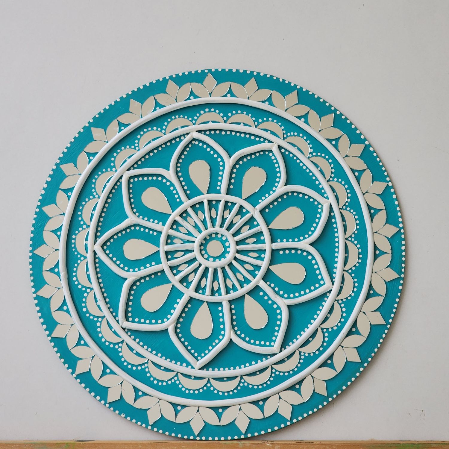 Add a refreshing touch of elegance to your home with this handcrafted Lippan Art mandala in soothing teal and white tones. The circular design features layered floral patterns with raised clay detailing, creating depth and symmetry that instantly draws attention.