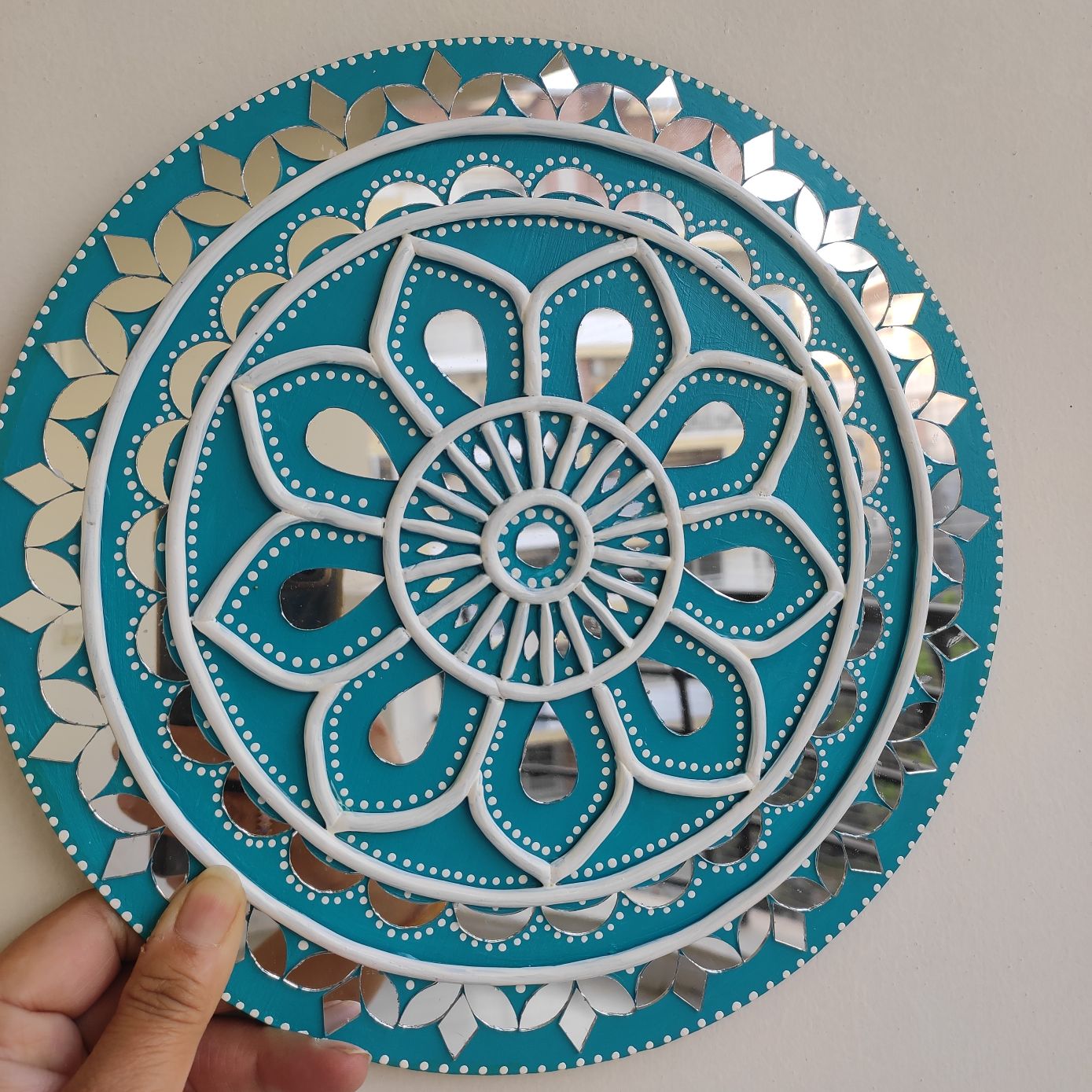 Inspired by traditional mud and mirror artistry, this piece showcases fine handcrafted work with delicate dot accents and intricate borders. The teal background enhances the white relief patterns, giving it a modern yet culturally rich appeal.