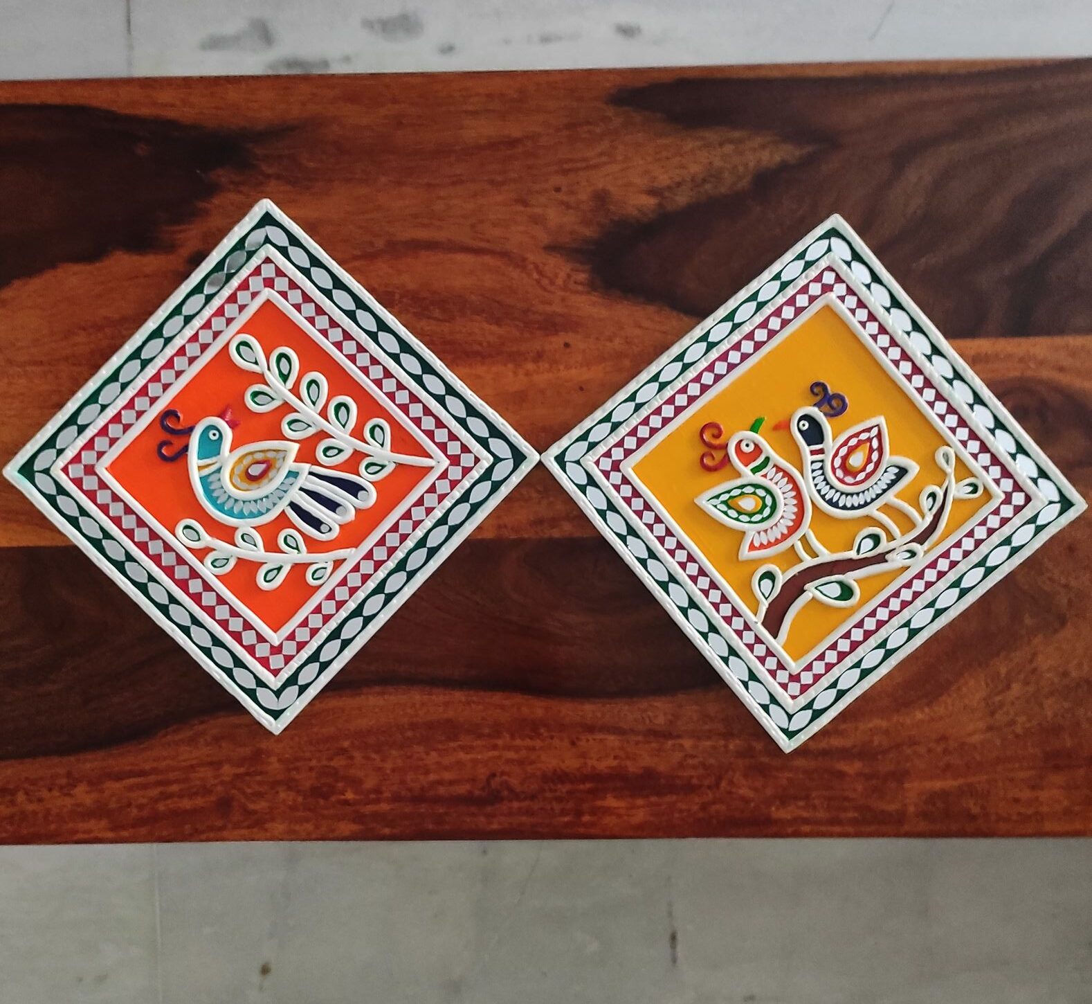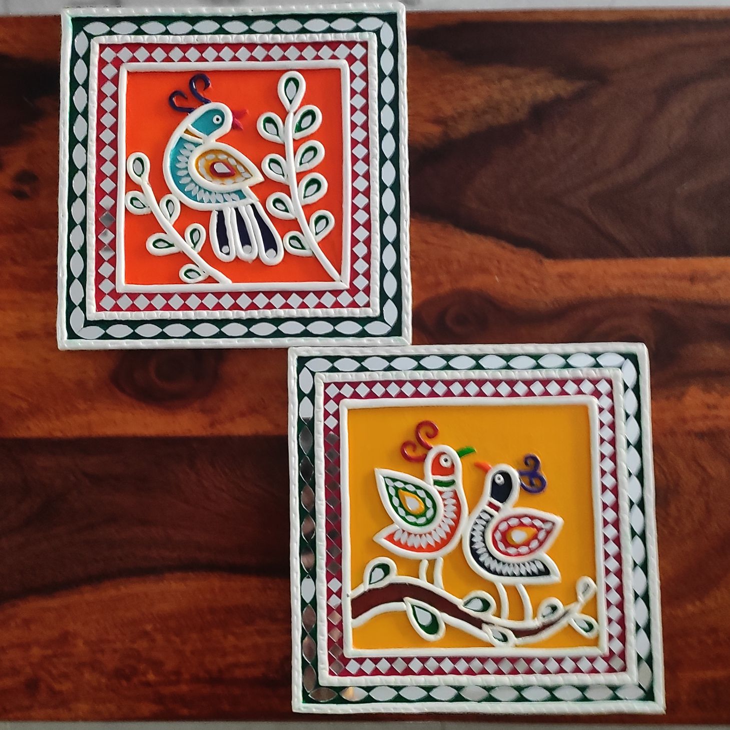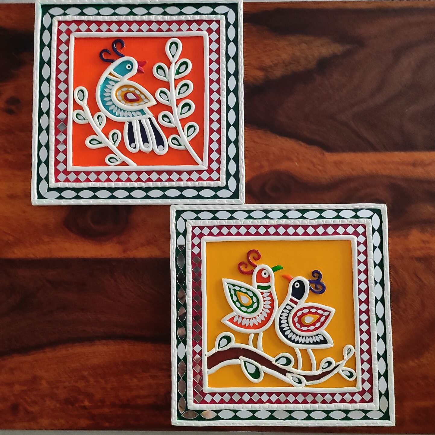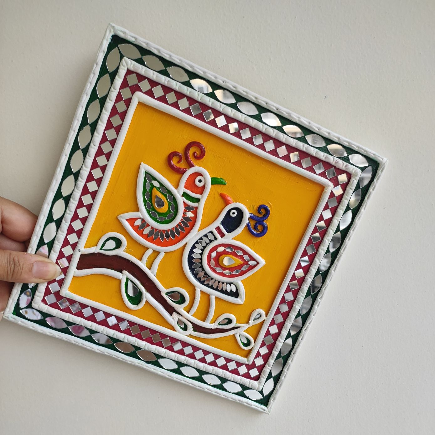 Each square piece is crafted using traditional mud techniques with raised clay detailing and decorative patterned borders inspired by classic mud and mirror art. The bold colors and playful bird motifs bring warmth, joy, and cultural character to any interior.