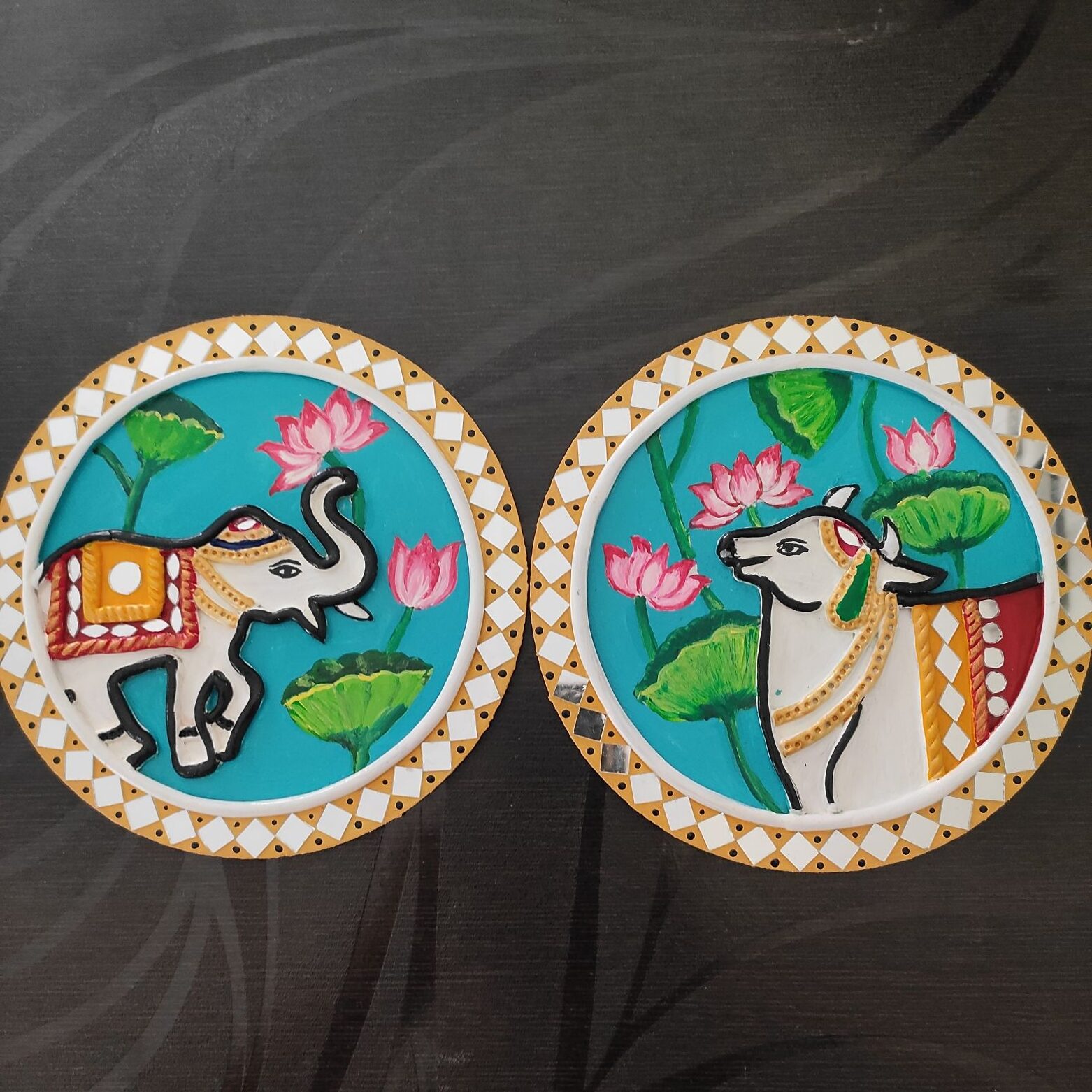 A vibrant handcrafted Lippan Art set featuring a graceful elephant and a sacred cow surrounded by blooming lotus flowers. Designed in rich colors with raised clay detailing and mirror accents, this duo reflects traditional charm and cultural symbolism. Perfect for adding warmth, positivity, and artistic character to your walls.