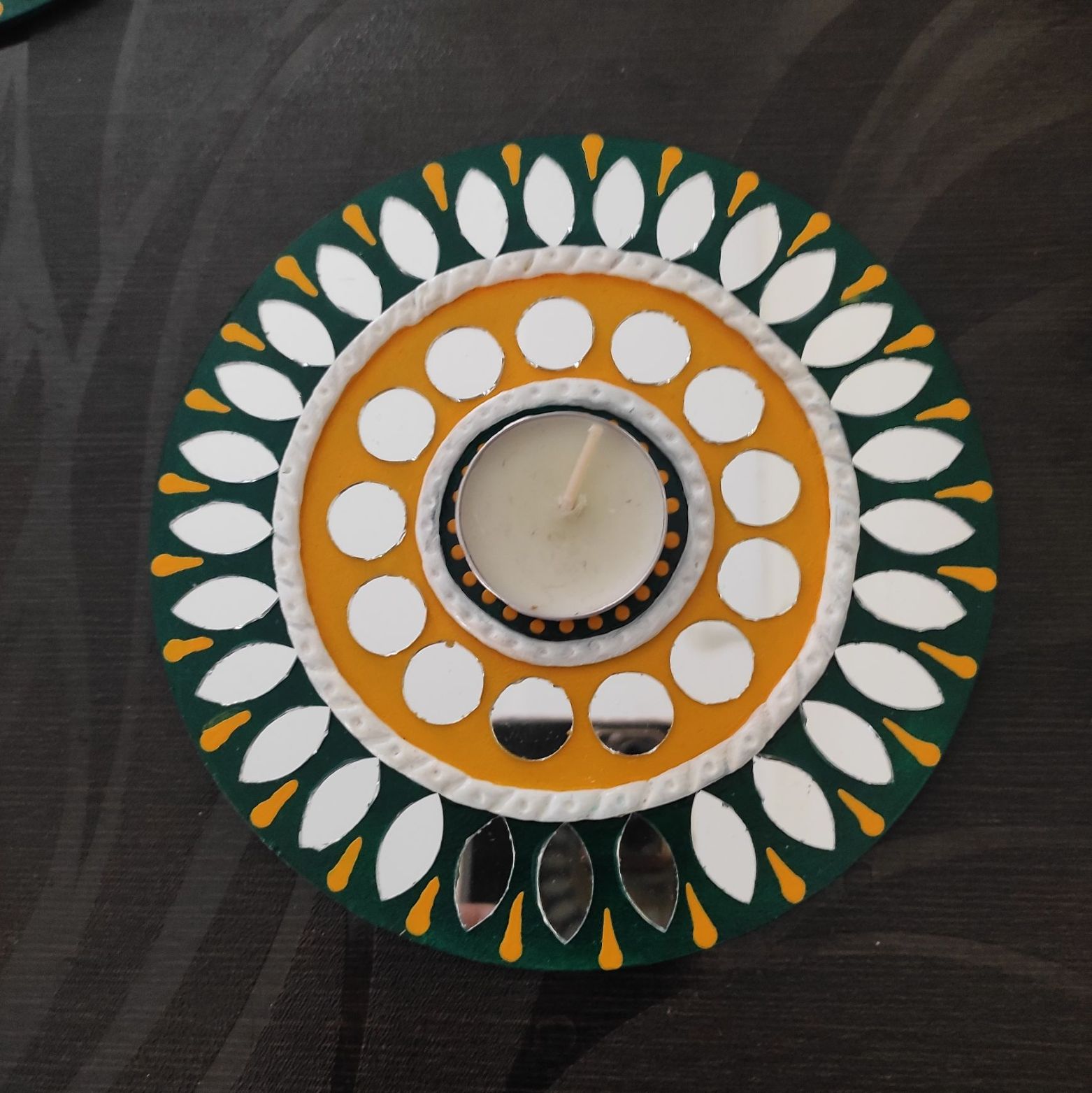 A vibrant handcrafted Lippan Art candle stand featuring a bold mandala design in warm green and yellow tones. The raised clay detailing and mirror accents create a beautiful glow when lit, enhancing its festive charm. Perfect for adding warmth, traditional elegance, and a soft ambient light to any space.