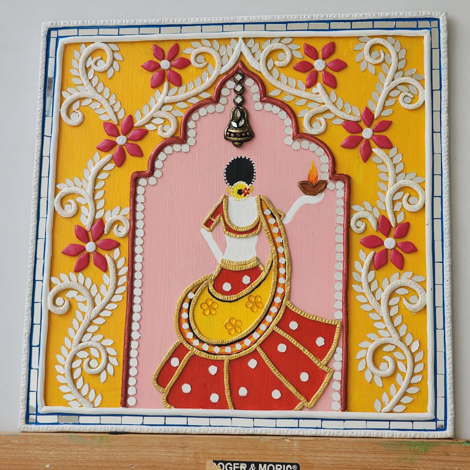 Celebrate the warmth of Indian tradition with this handcrafted Lippan Art wall panel, depicting a graceful Indian woman holding a diya, a symbol of light, devotion, and positivity.