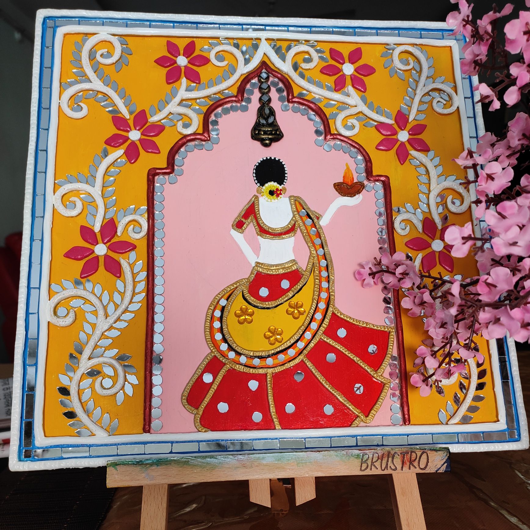 Created using the age-old Kutch Lippan art, mud & mirror technique, this artwork combines raised clay work, hand-placed mirrors, and vibrant hand-painted colors. The yellow backdrop radiates joy and festivity, while the flowing attire, floral motifs, and mirror embellishments add depth and movement to the piece.