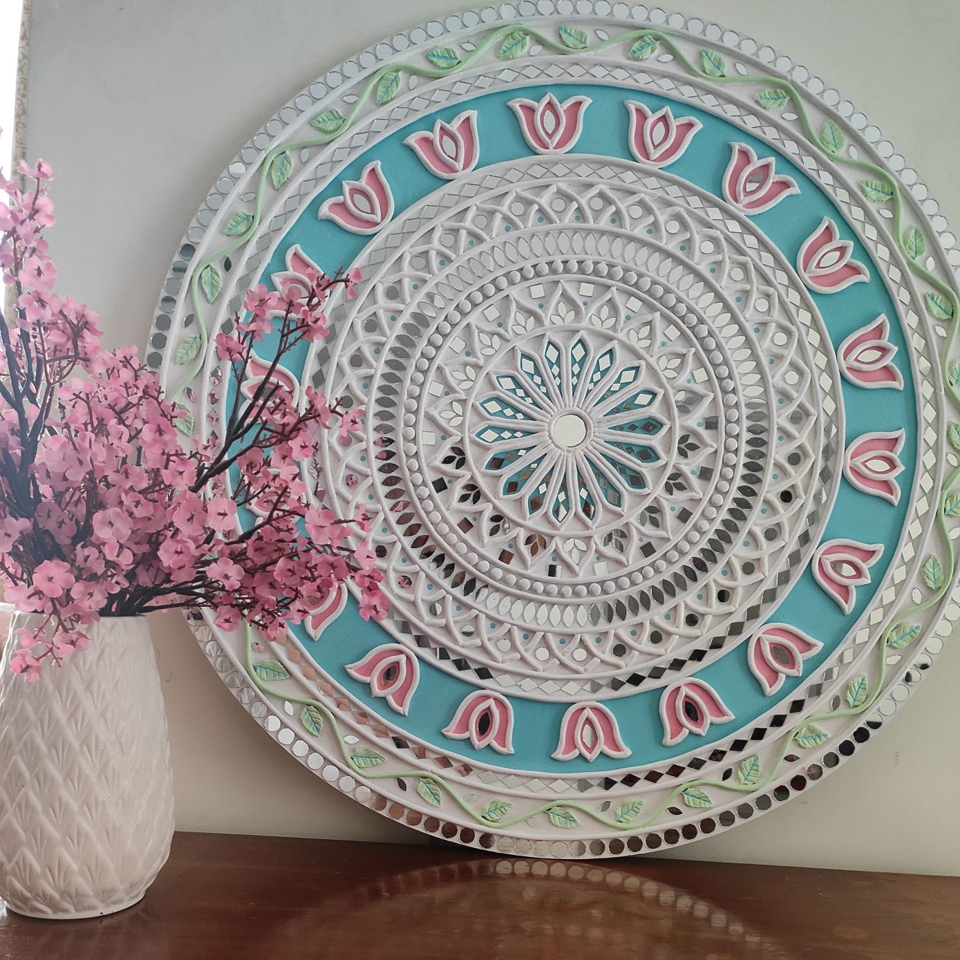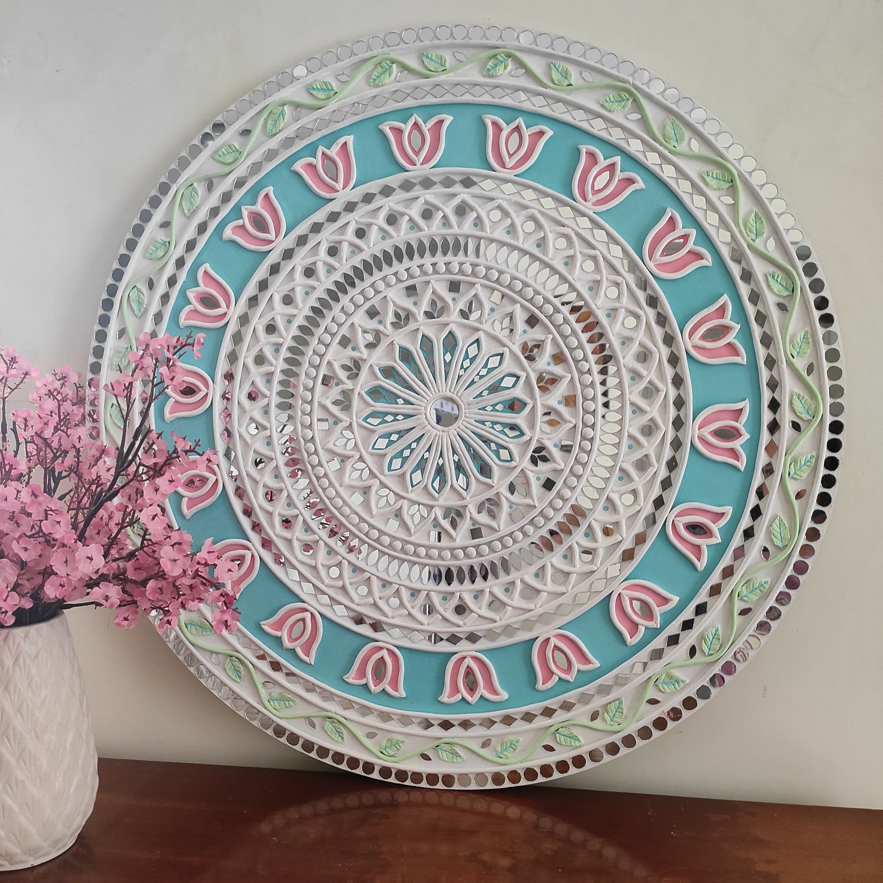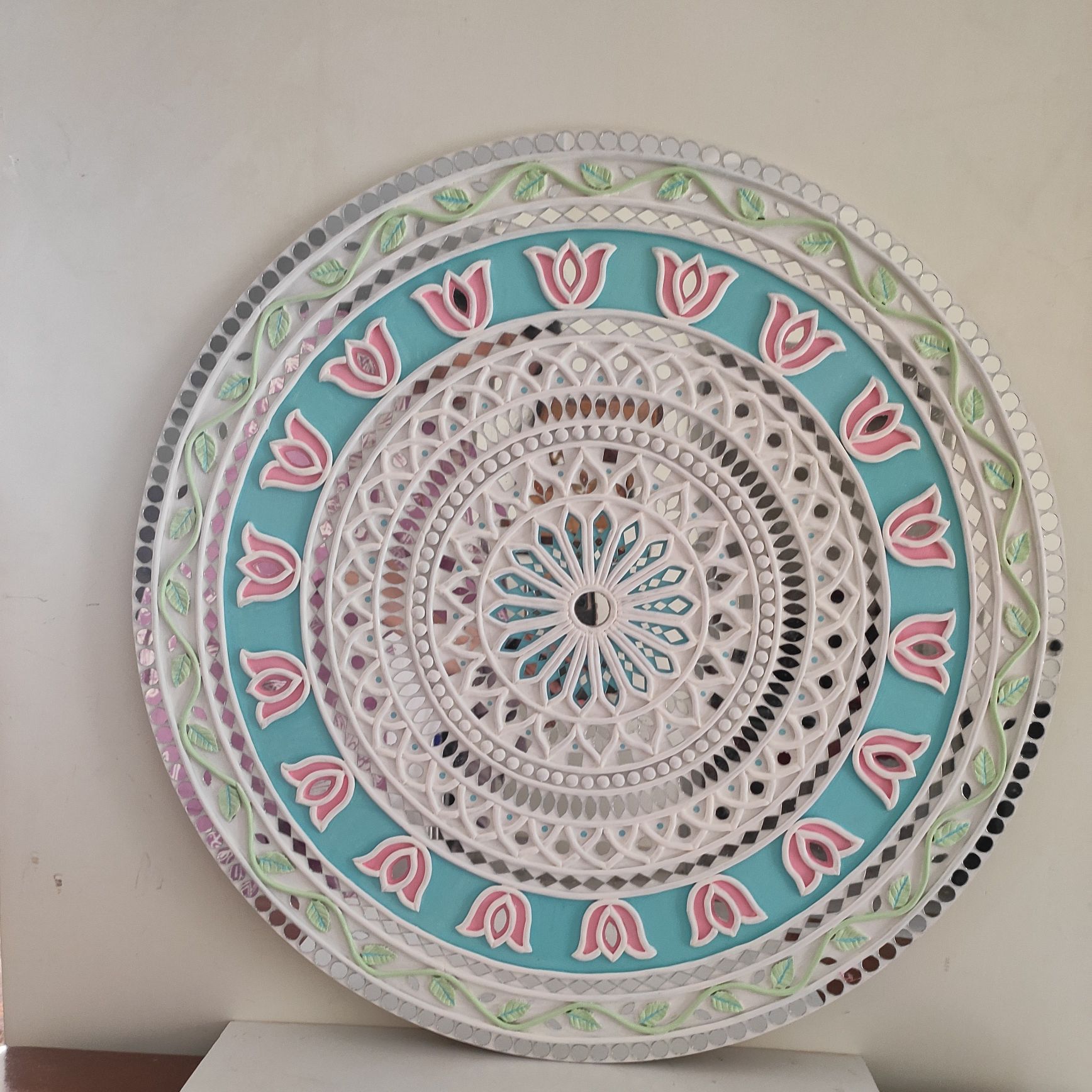 A graceful handcrafted Lippan Art wall decor featuring a delicate lotus mandala in soothing pastel tones. Intricate raised clay detailing and mirror accents create depth, texture, and a soft luminous effect. Perfect for adding calm elegance and artistic charm to modern or traditional interiors.