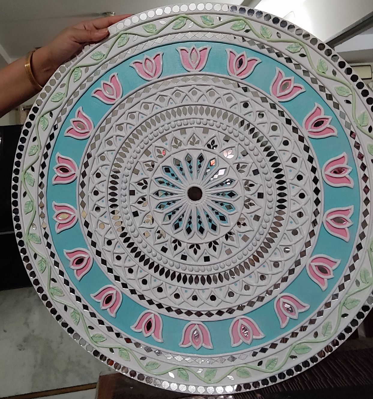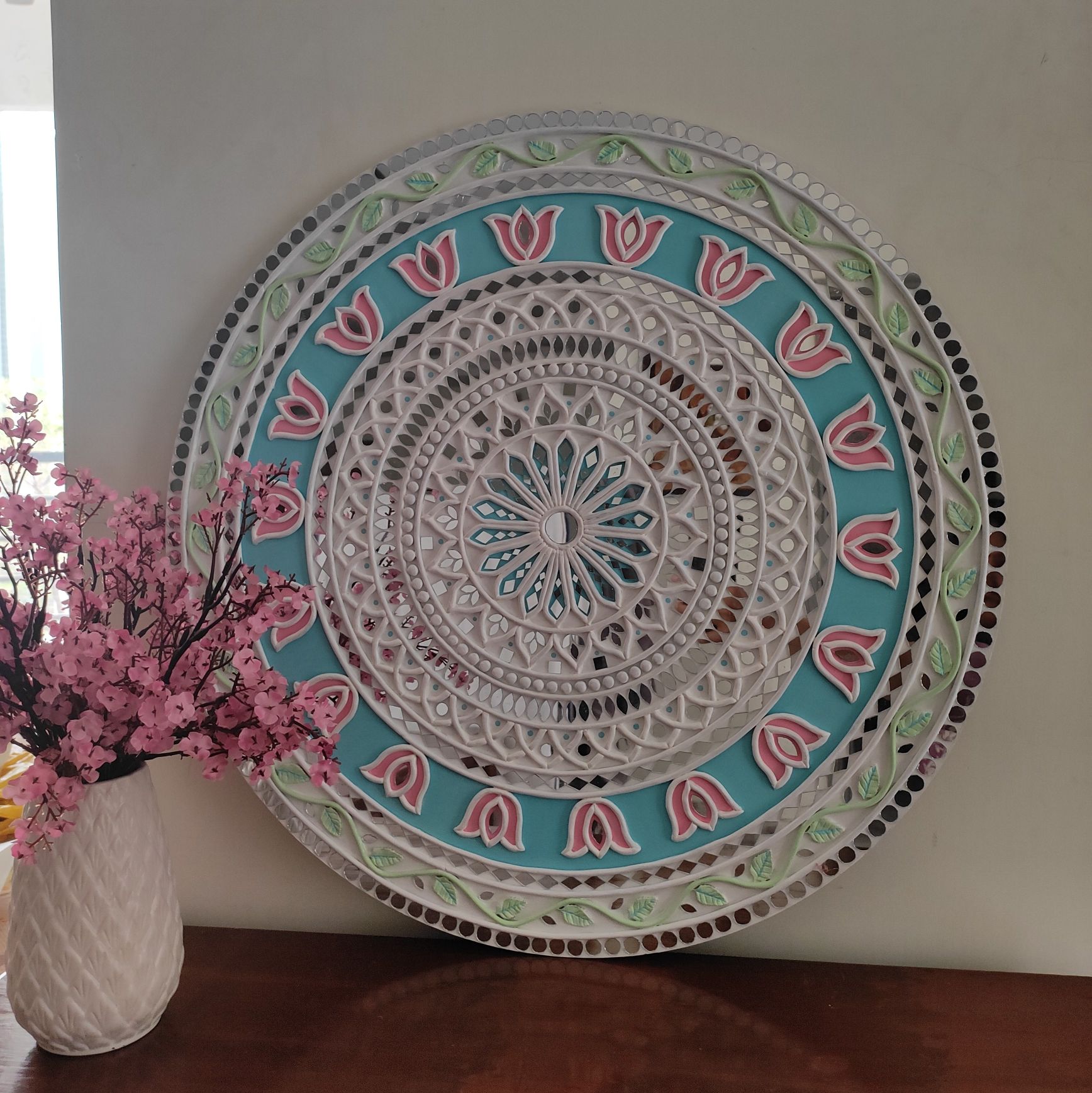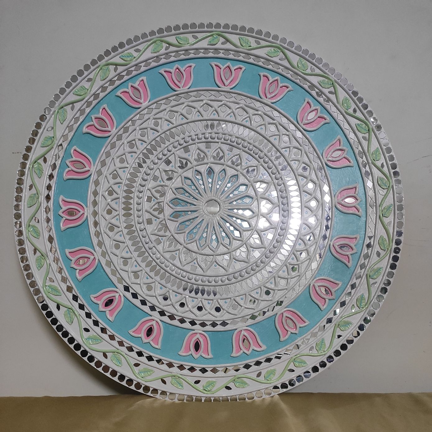 A graceful handcrafted Lippan Art wall decor featuring a delicate lotus mandala in soothing pastel tones. Intricate raised clay detailing and mirror accents create depth, texture, and a soft luminous effect. Perfect for adding calm elegance and artistic charm to modern or traditional interiors.