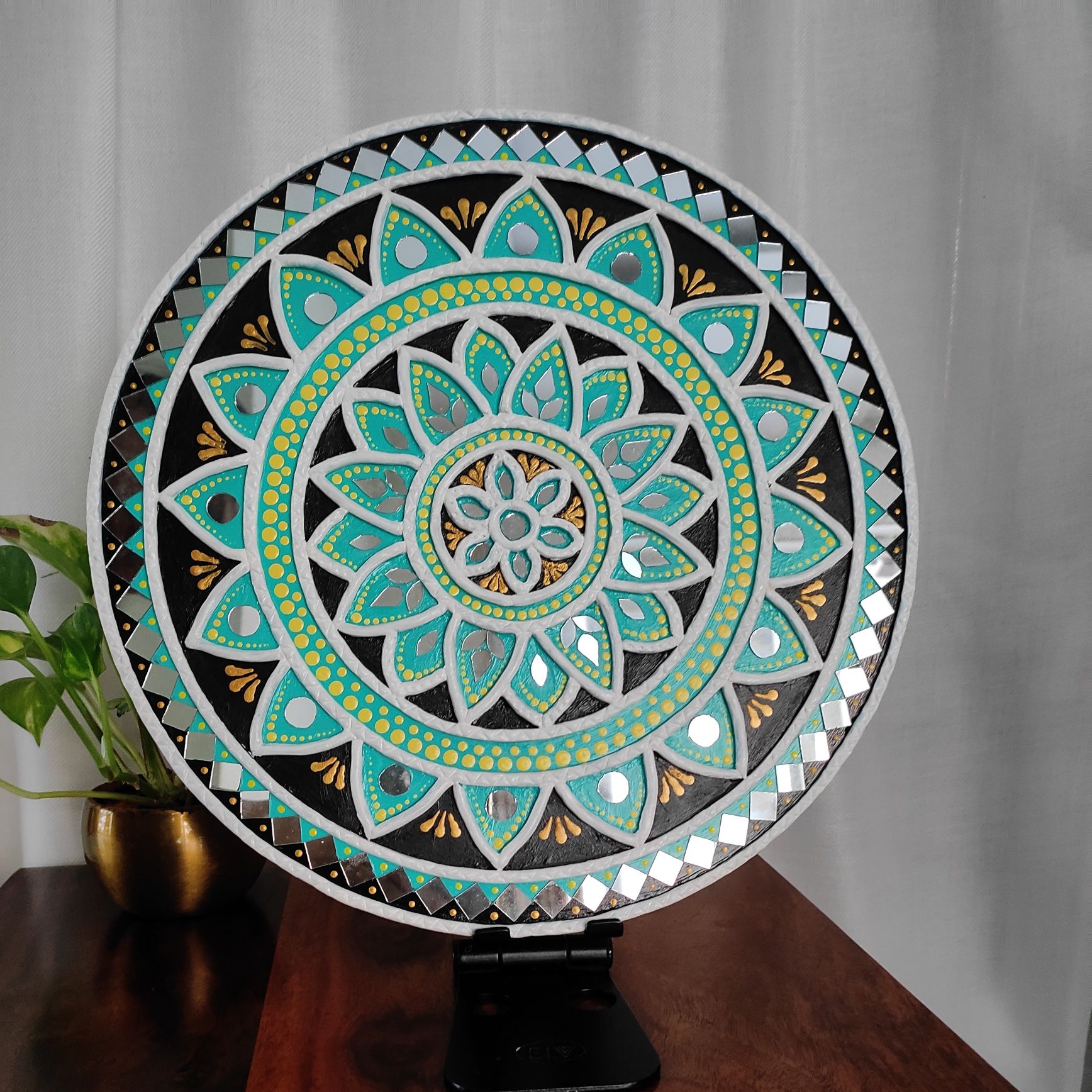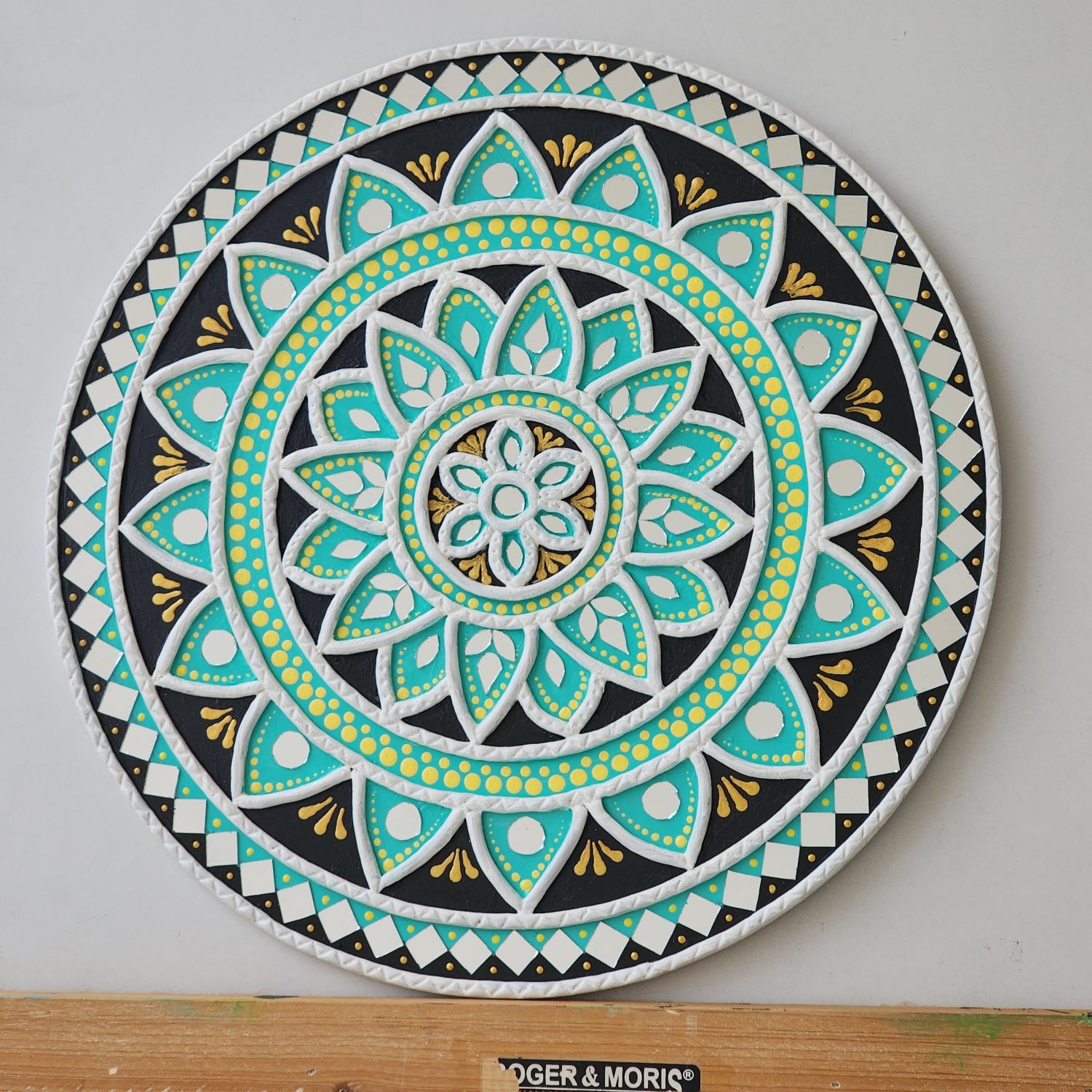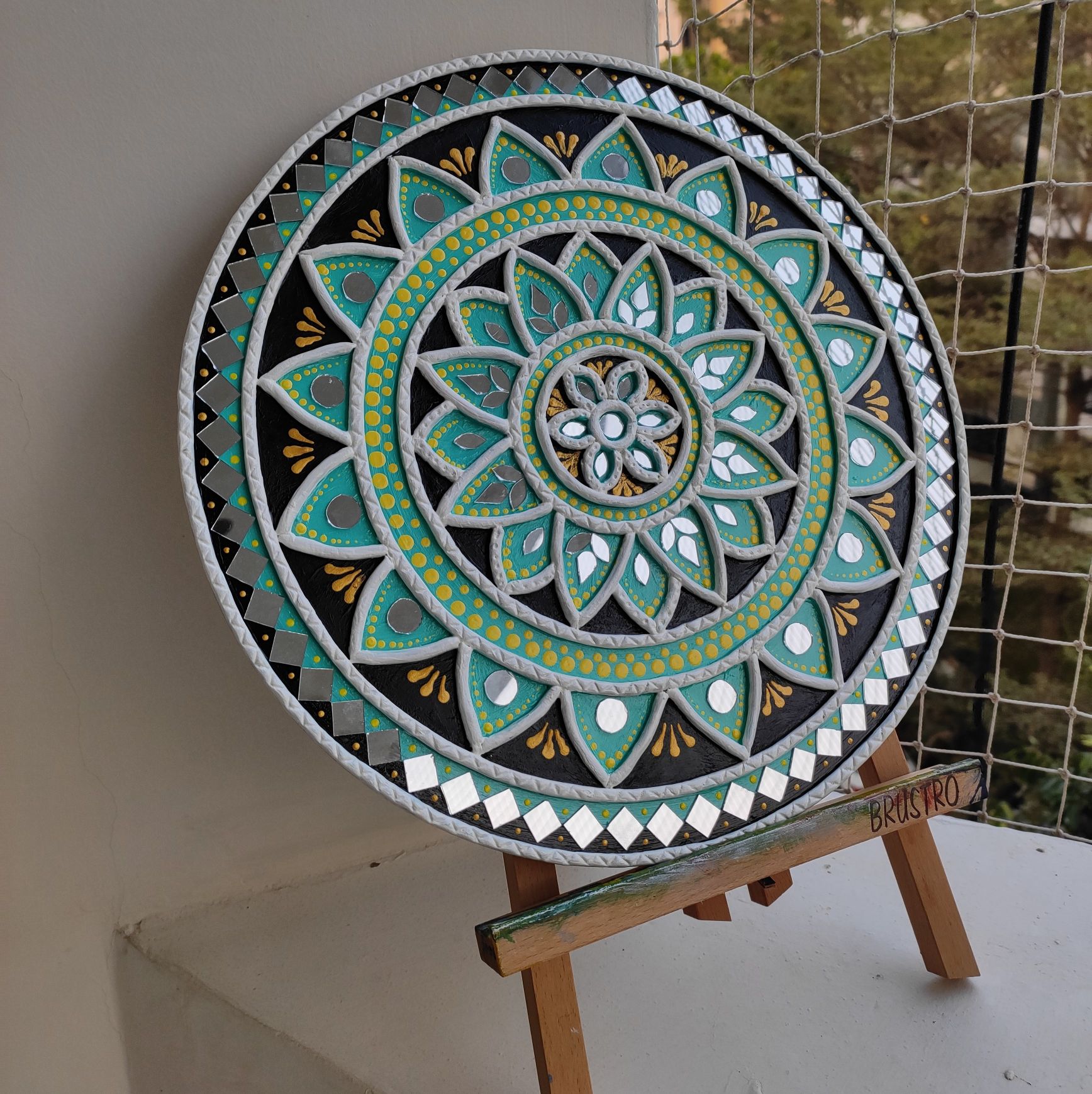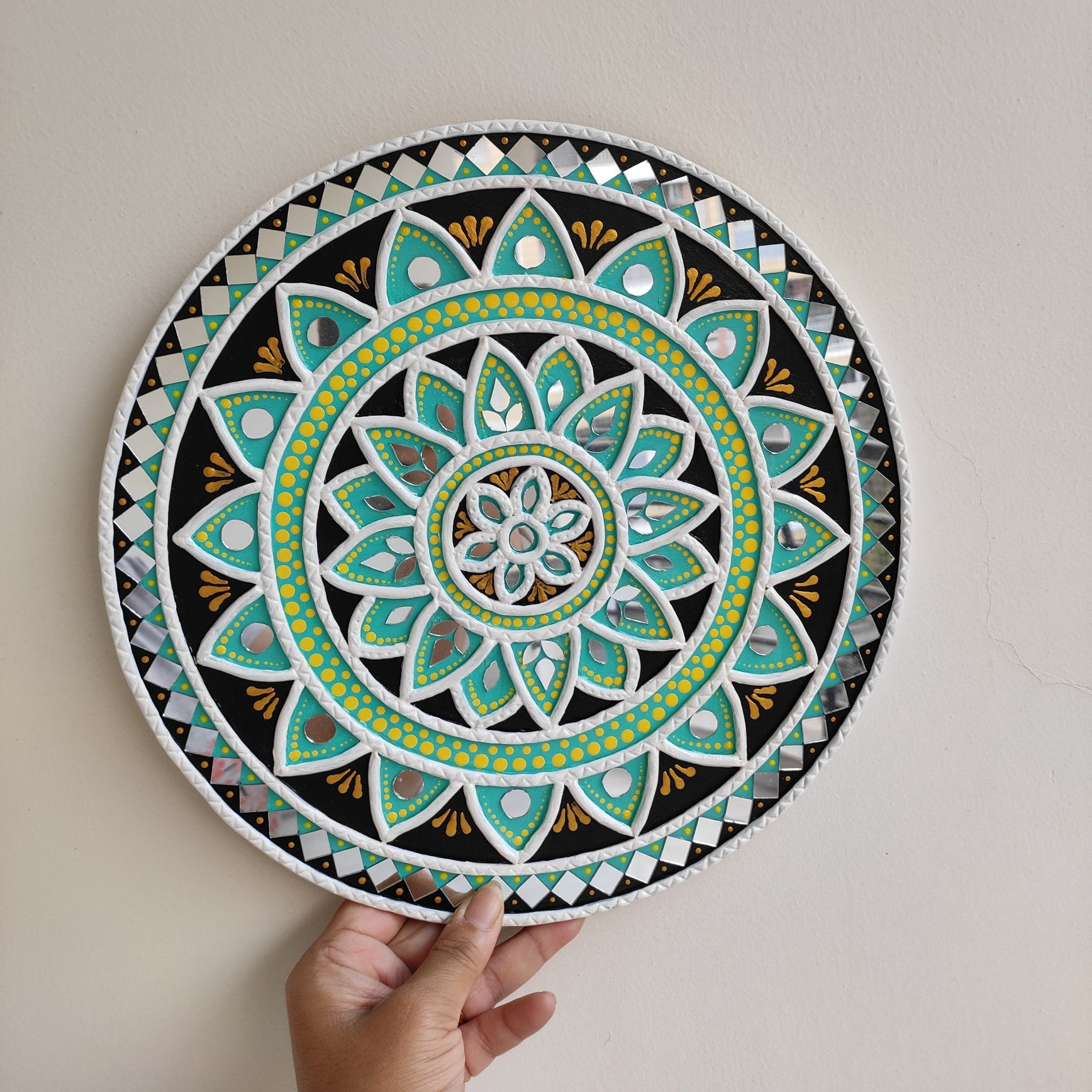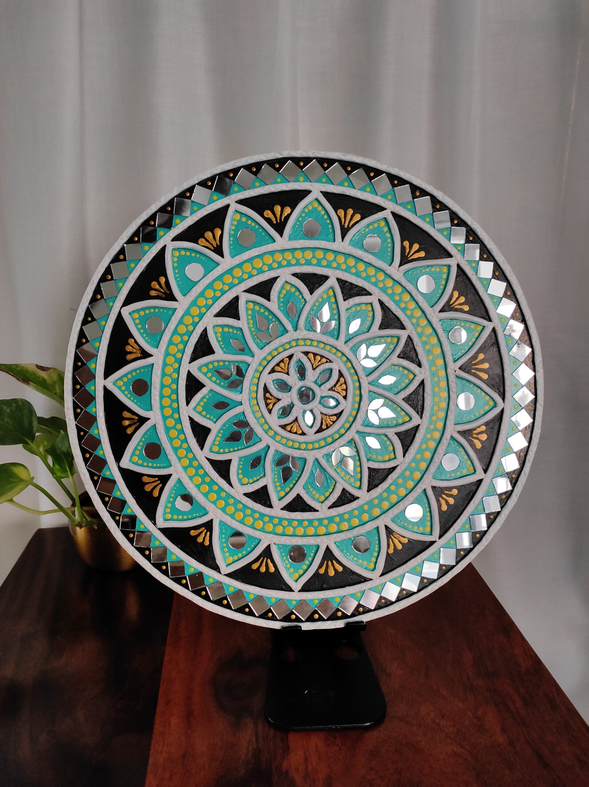 Each detail is carefully shaped using traditional mud (clay) relief work and embellished with hand-placed mirrors. The layered mandala pattern adds depth and rhythm, while the reflective elements catch light beautifully, enhancing the artwork’s presence.