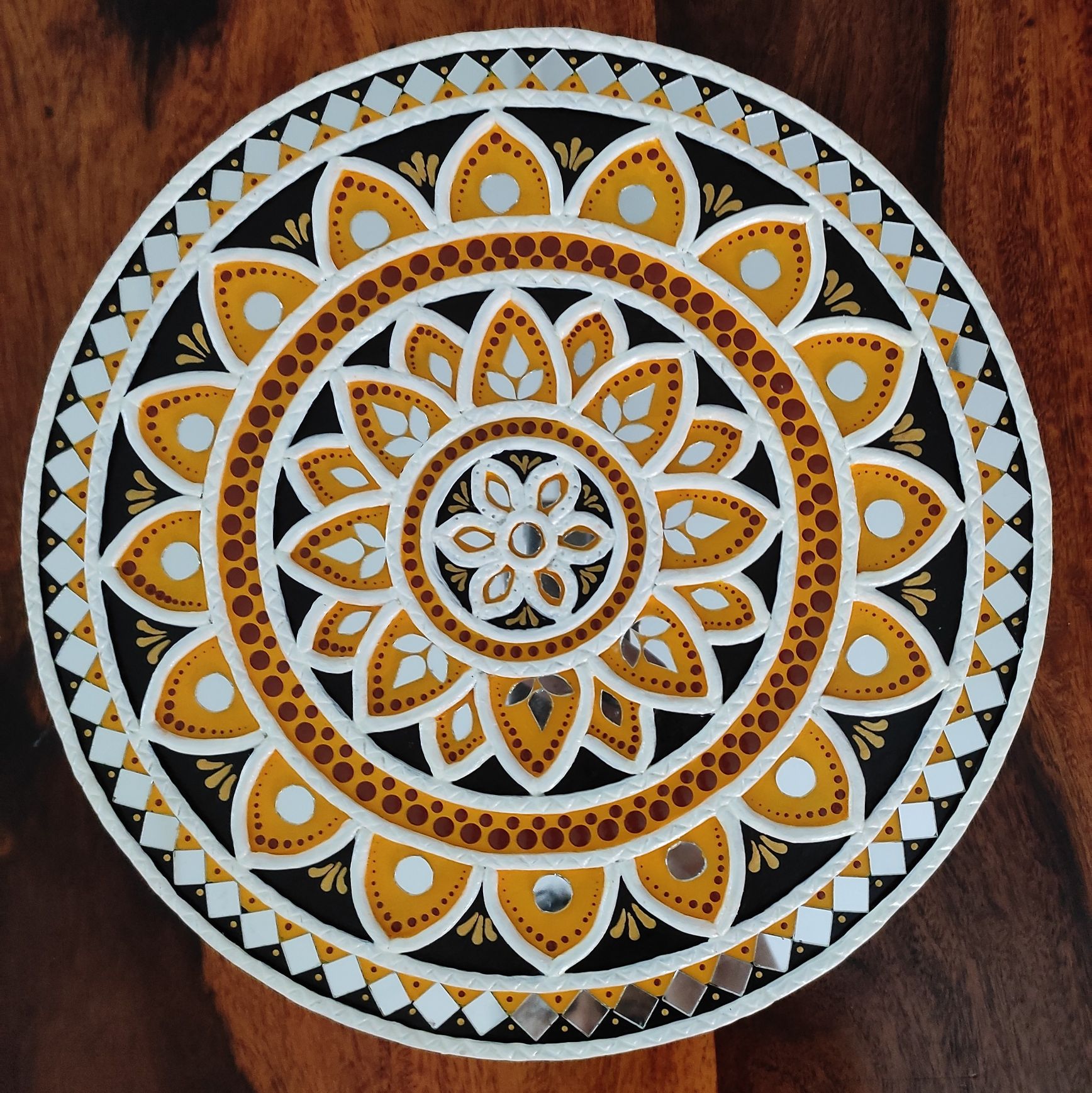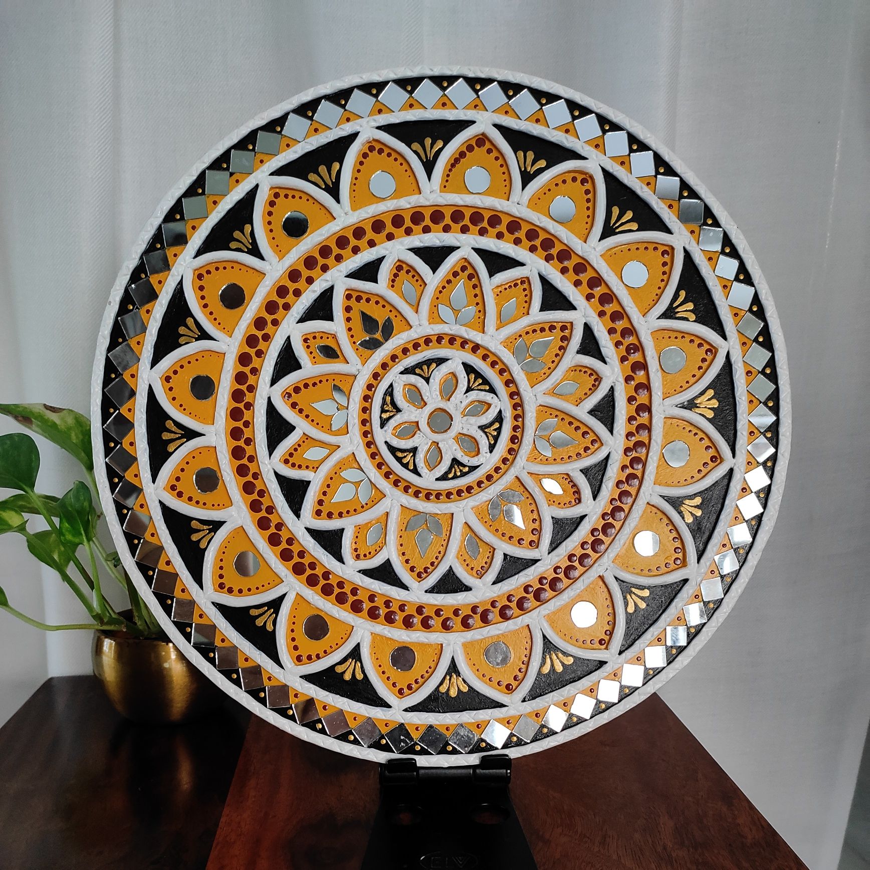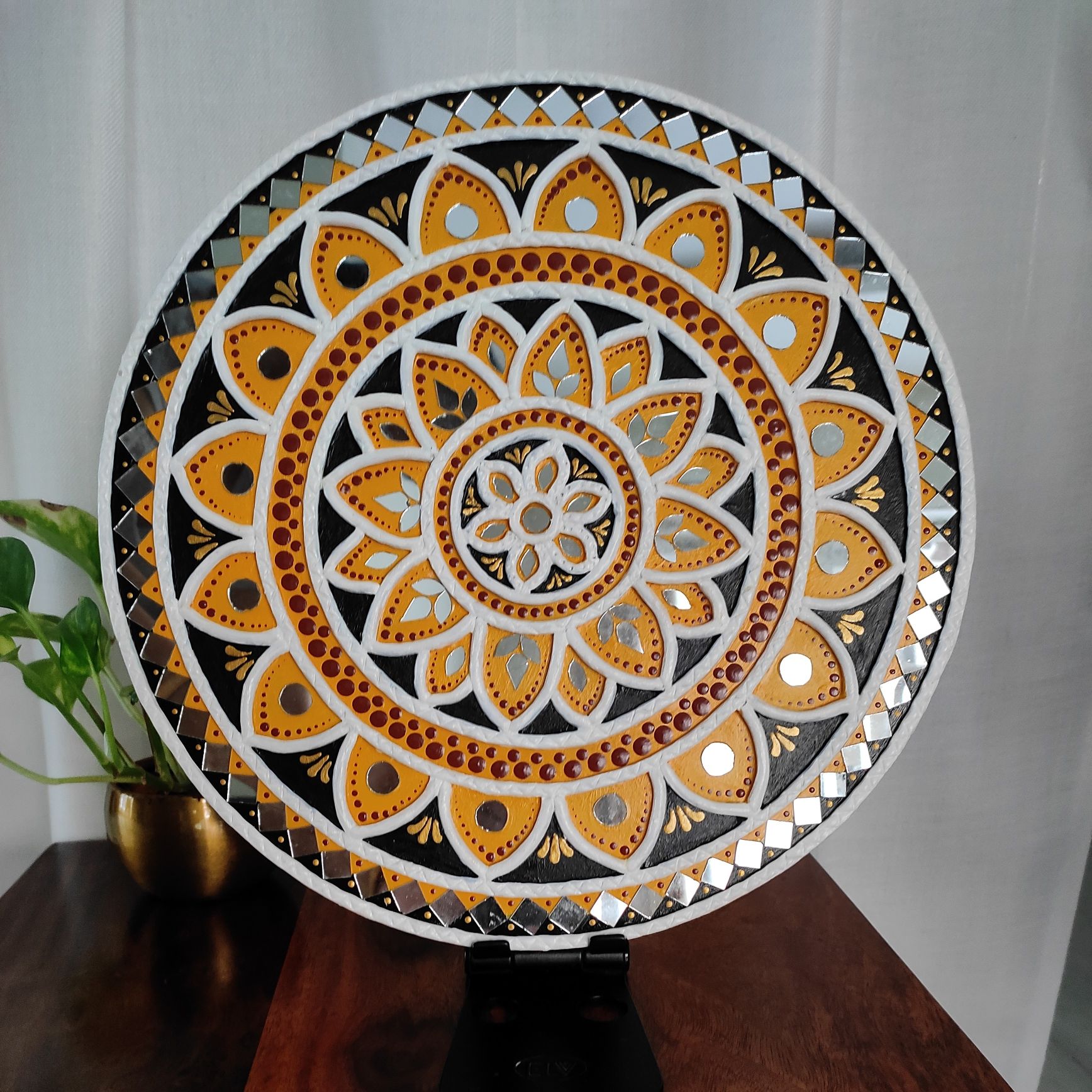 Created using raised clay work and carefully placed mirror accents, this artwork offers depth, texture, and subtle shimmer. The combination of yellow, black, white, and earthy tones brings a perfect balance of tradition and modern elegance.