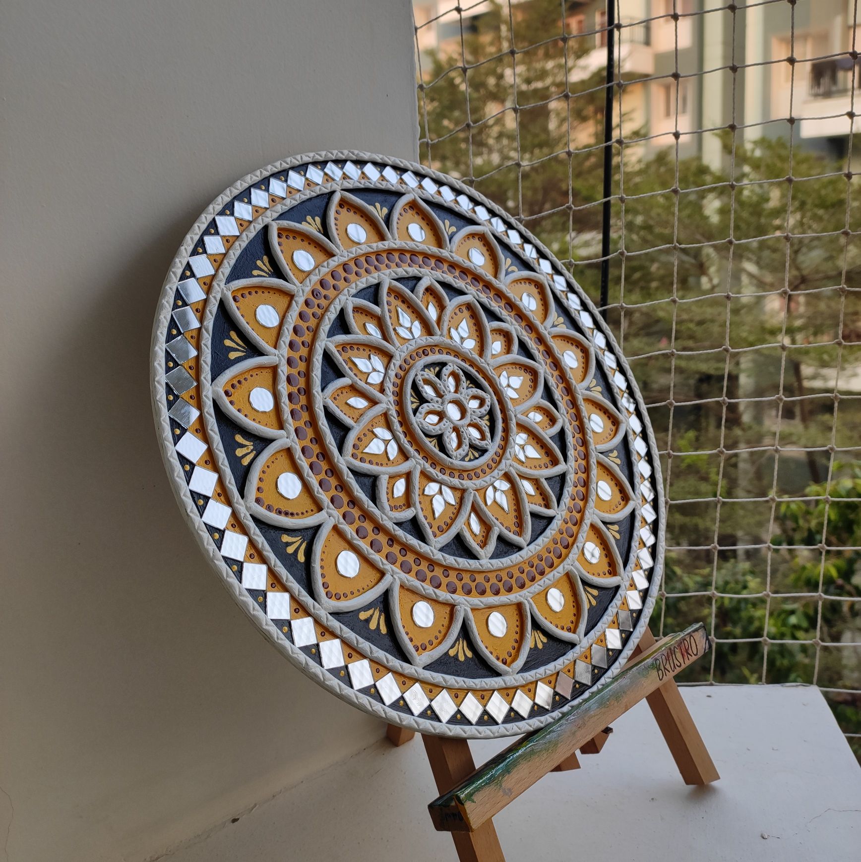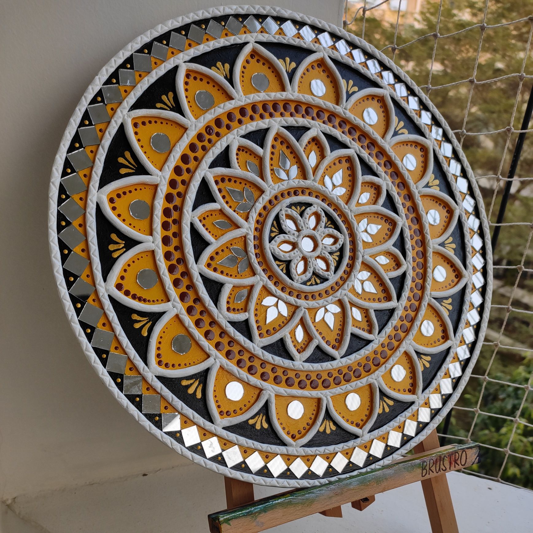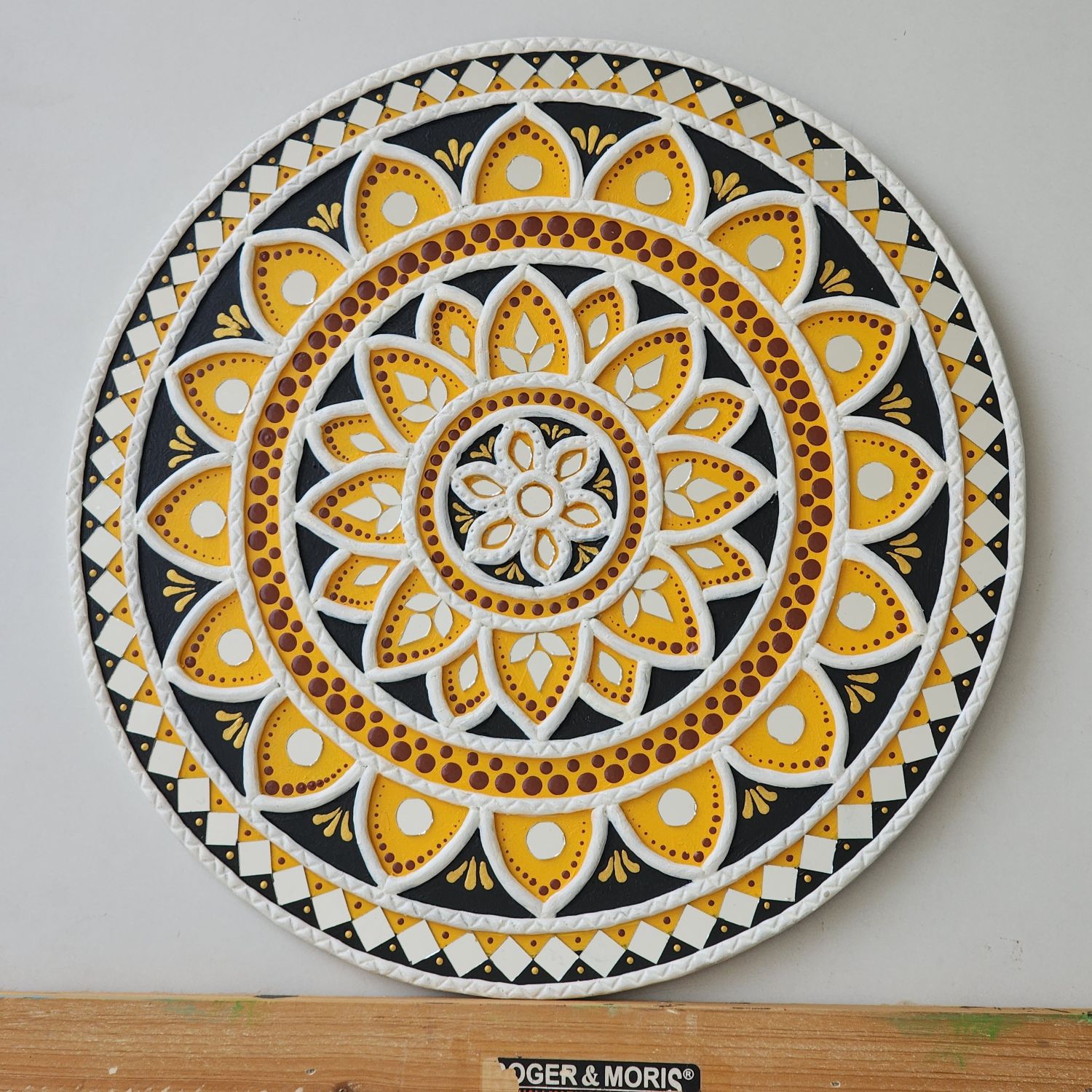 Created using raised clay work and carefully placed mirror accents, this artwork offers depth, texture, and subtle shimmer. The combination of yellow, black, white, and earthy tones brings a perfect balance of tradition and modern elegance.