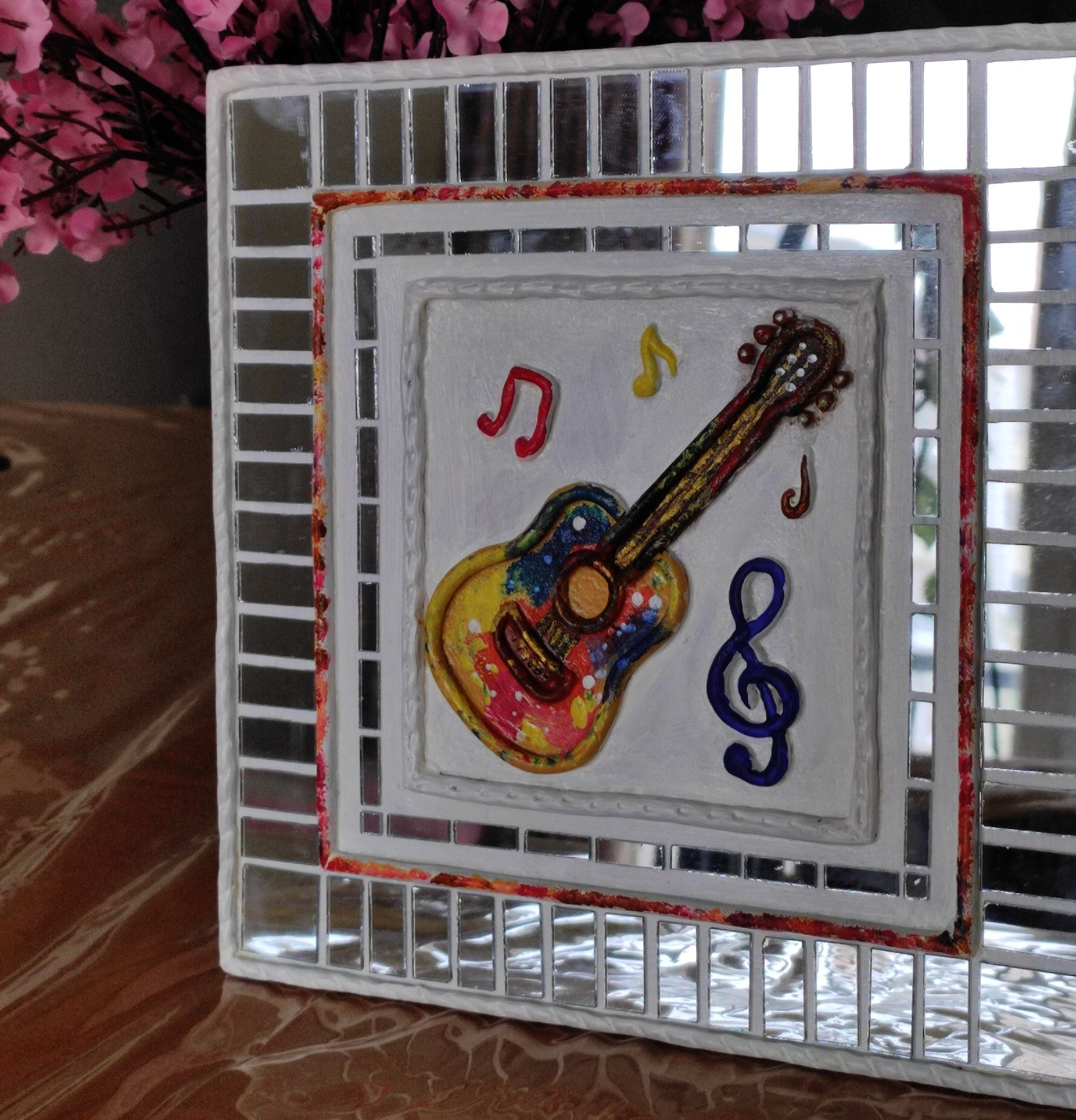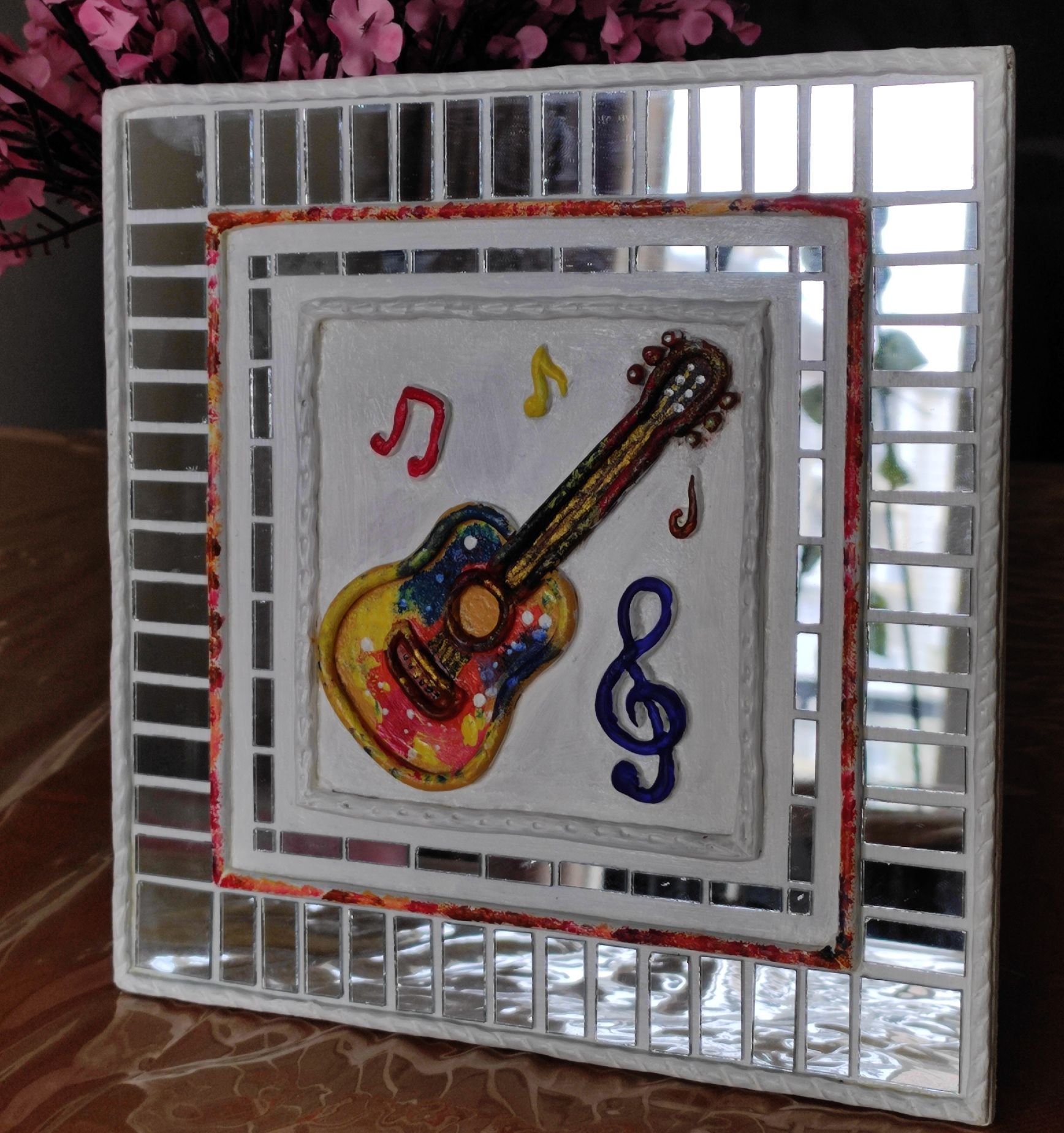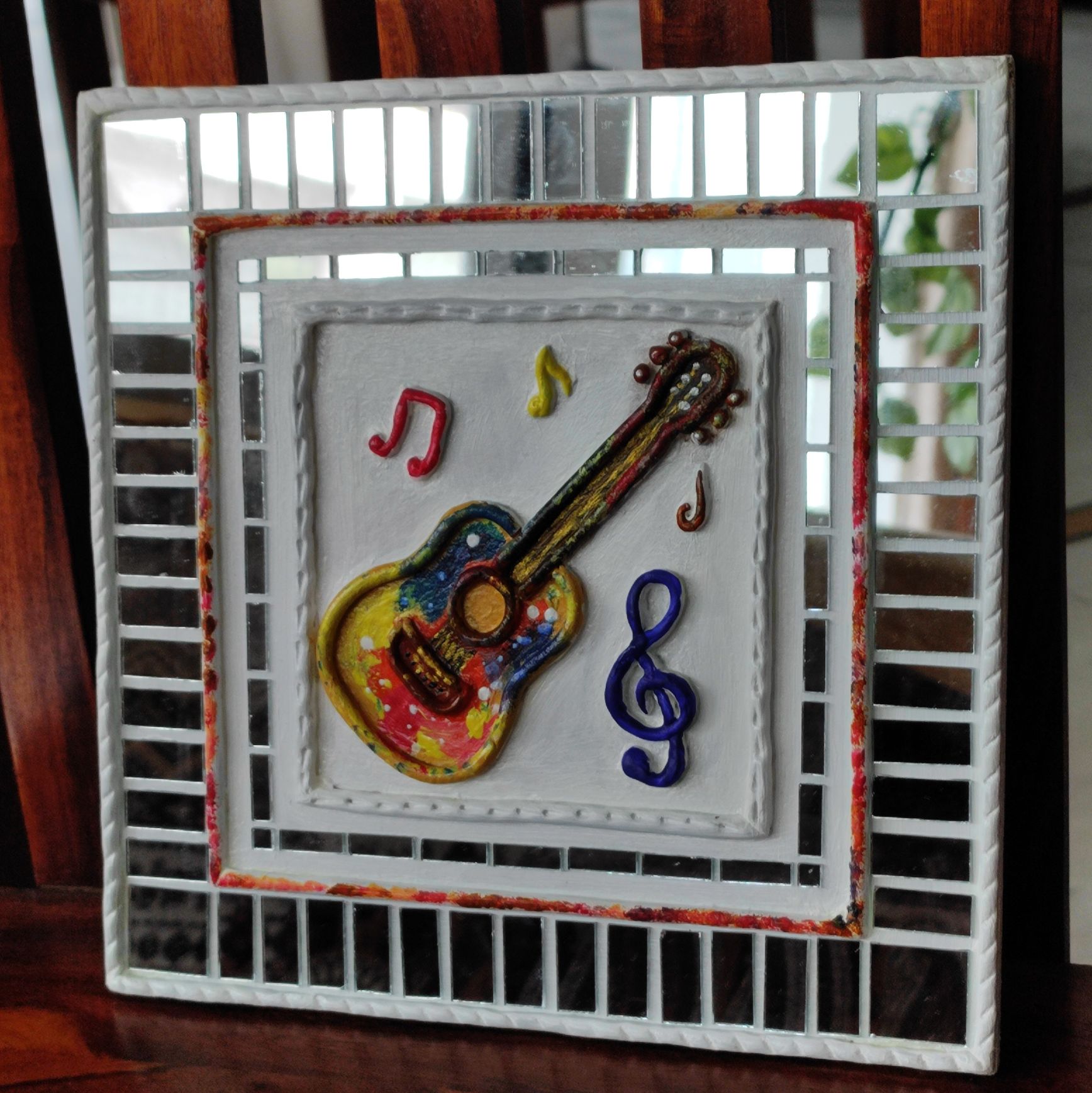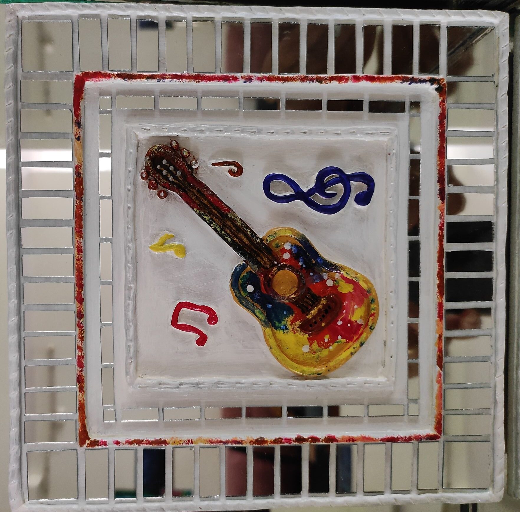 The raised clay guitar, musical notes, and symbols are carefully hand-shaped and painted in vibrant colors, creating a lively focal point. Surrounded by a mirror-bordered frame, the artwork reflects light beautifully, adding depth and energy to your space.
