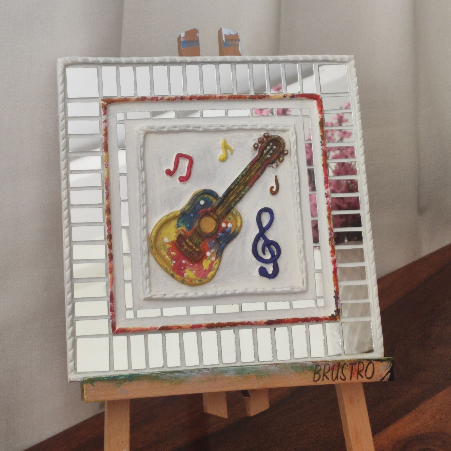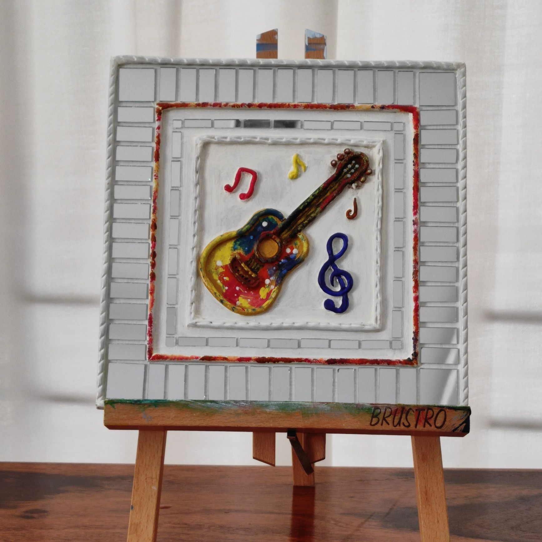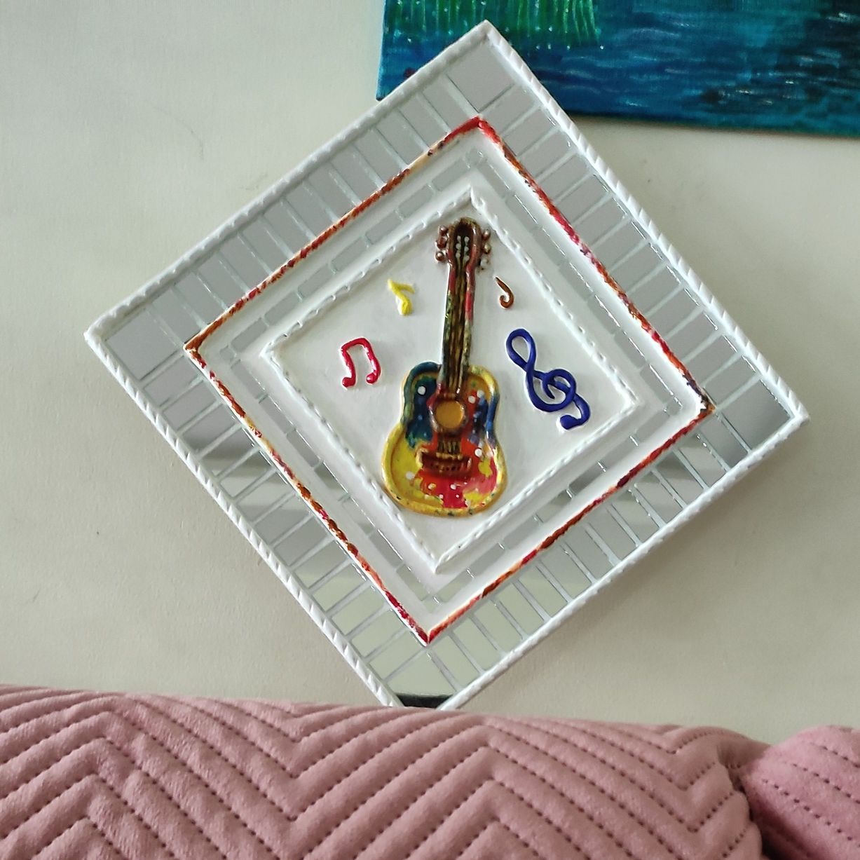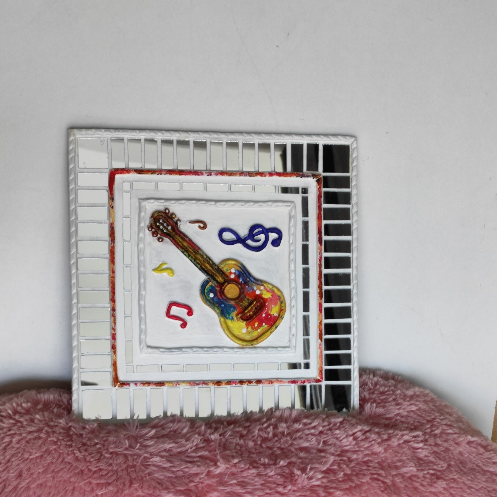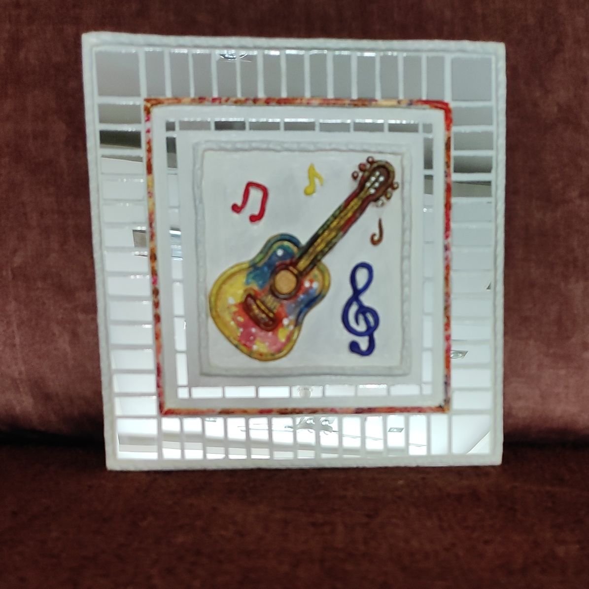 The raised clay guitar, musical notes, and symbols are carefully hand-shaped and painted in vibrant colors, creating a lively focal point. Surrounded by a mirror-bordered frame, the artwork reflects light beautifully, adding depth and energy to your space.