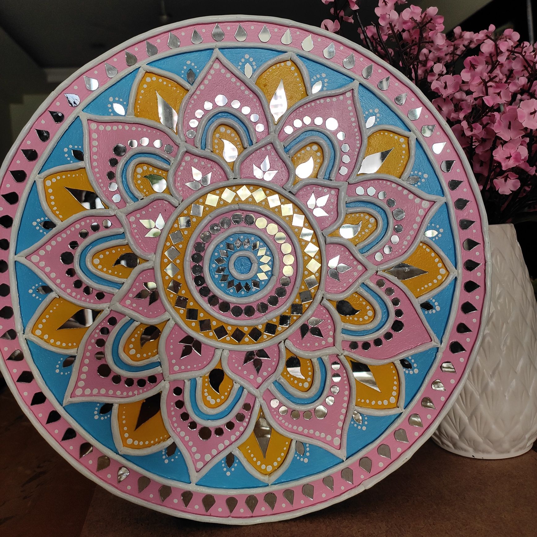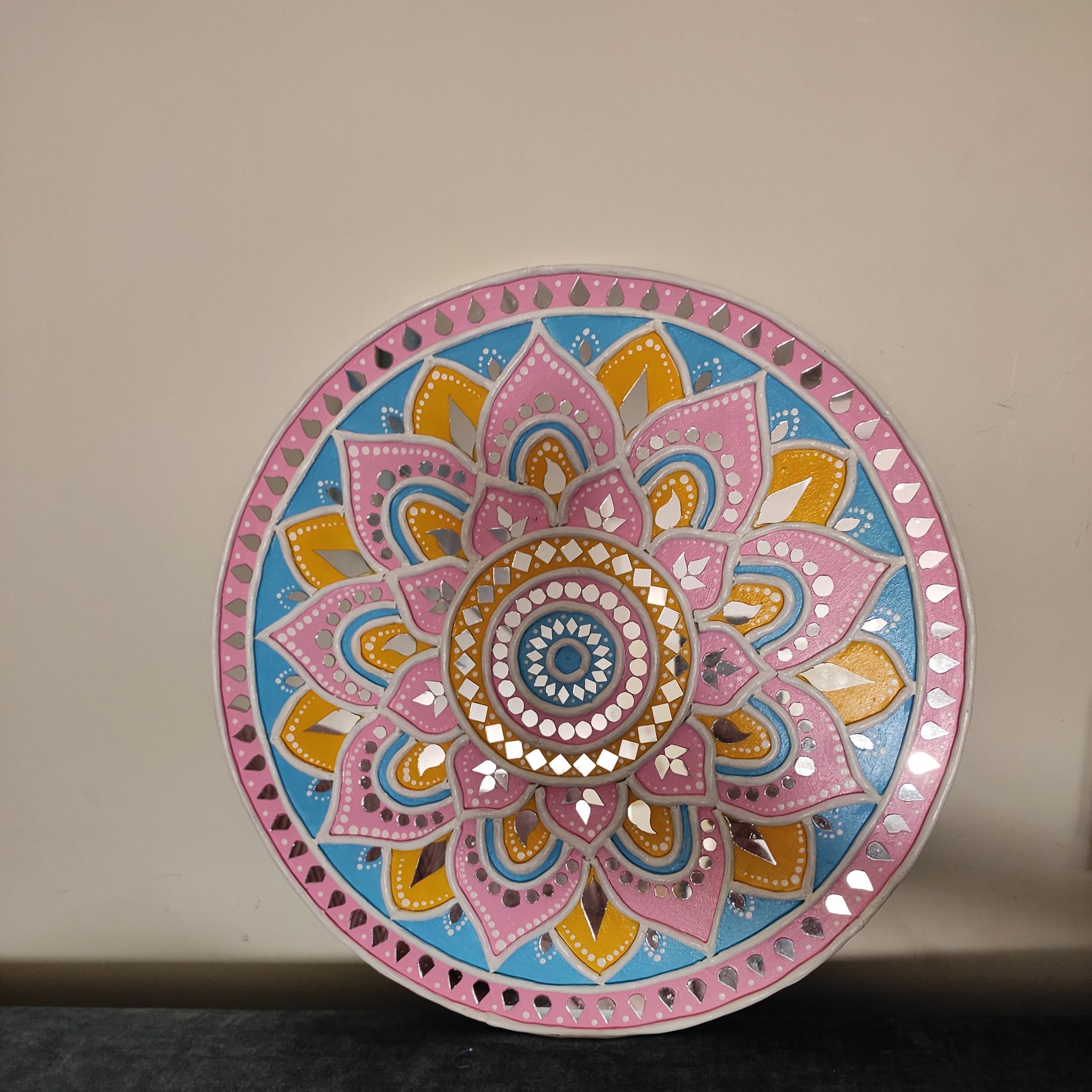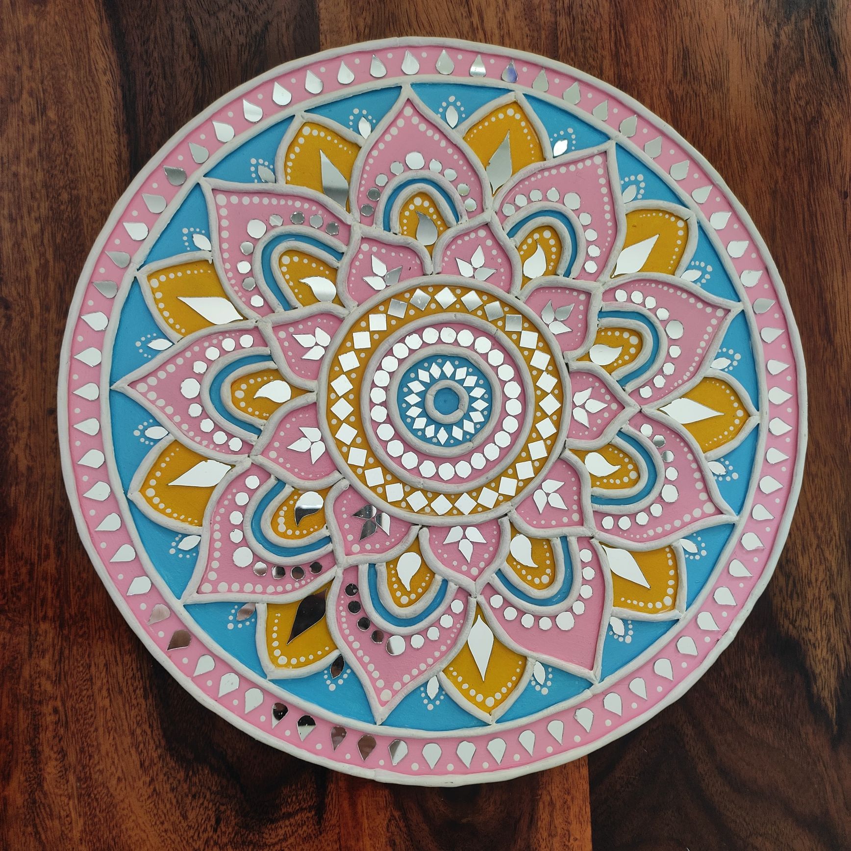 Crafted using traditional mud and mirror techniques, the raised clay work adds depth and texture, while delicate detailing enhances the symmetry of the circular pattern. The pastel tones give it a fresh and contemporary feel, making it suitable for both modern and traditional interiors.