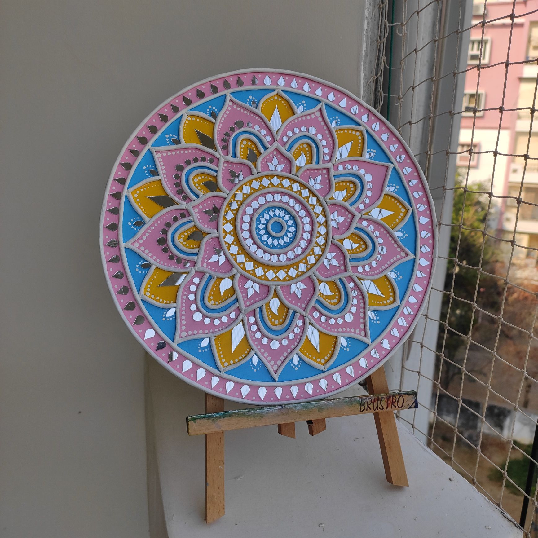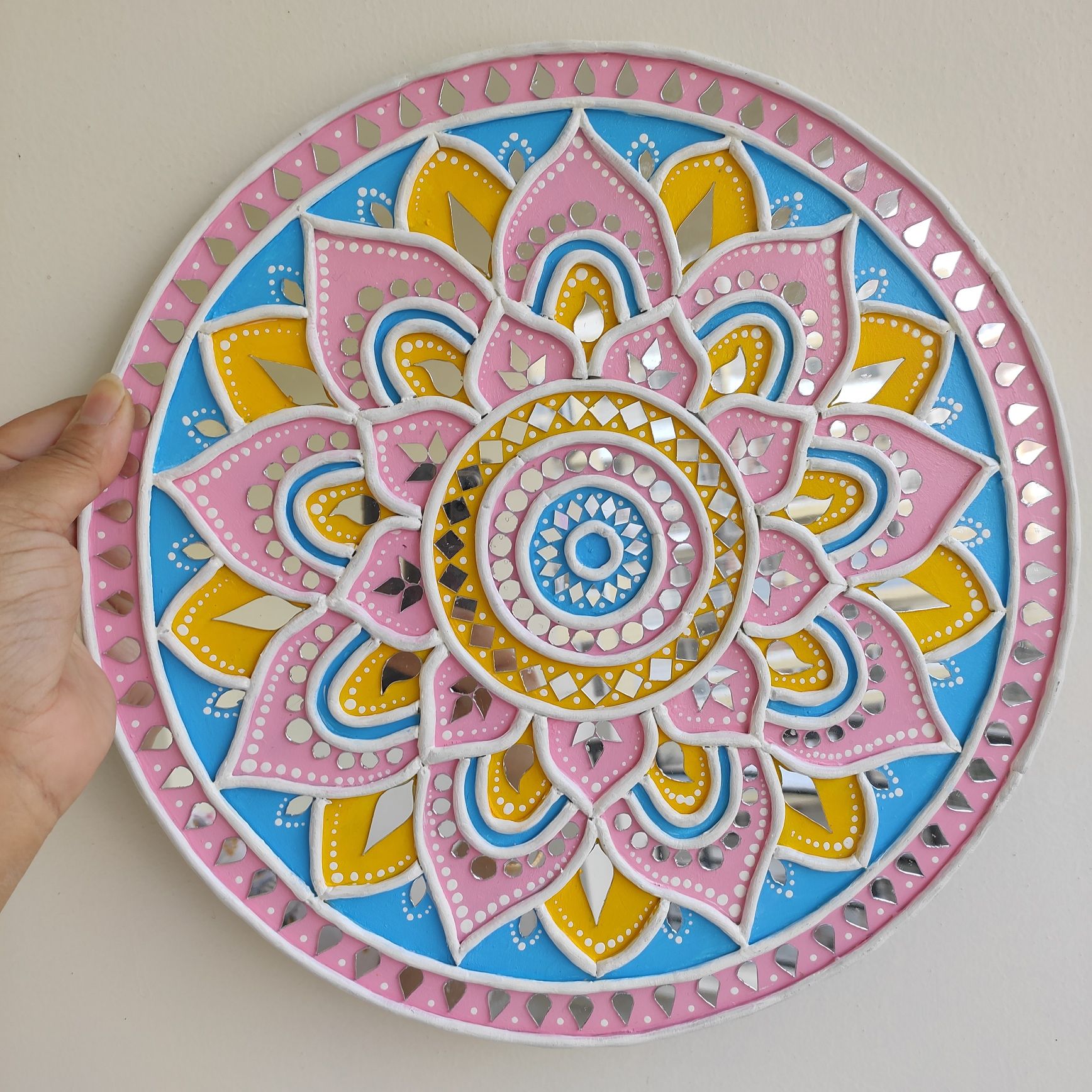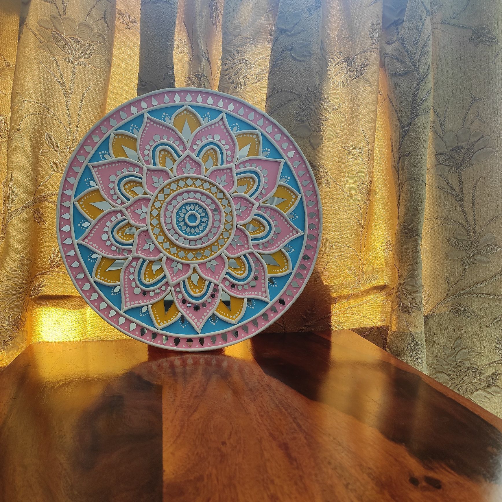 Crafted using traditional mud and mirror techniques, the raised clay work adds depth and texture, while delicate detailing enhances the symmetry of the circular pattern. The pastel tones give it a fresh and contemporary feel, making it suitable for both modern and traditional interiors.