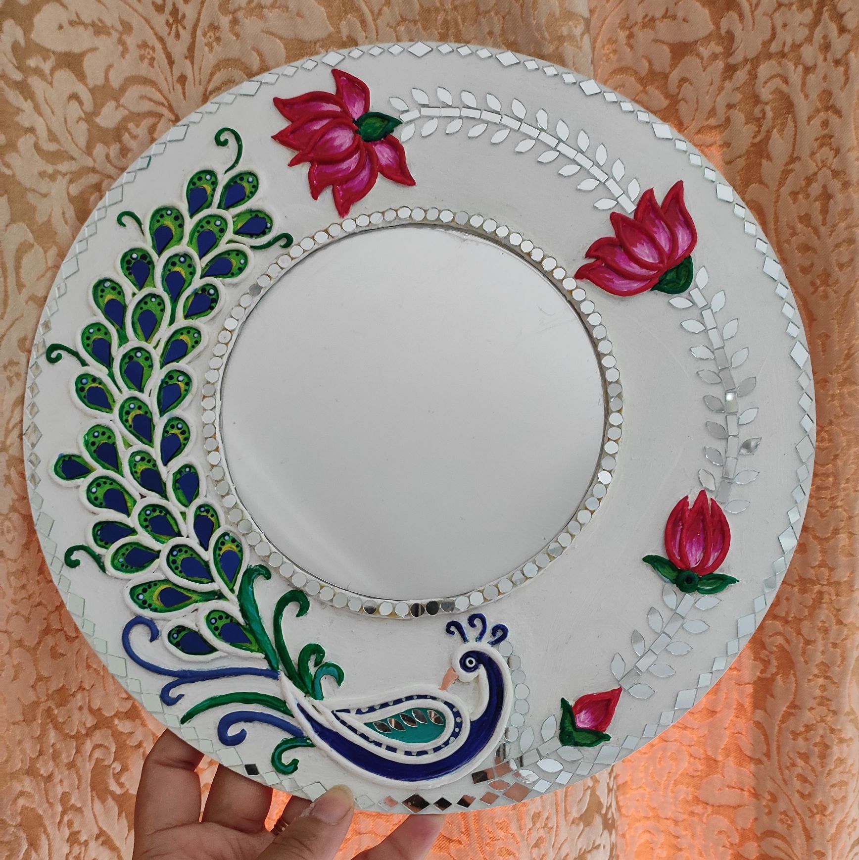 The raised clay work is hand-shaped and painted in soothing tones, while the central mirror reflects light softly, enhancing the artwork’s presence. The peacock symbolizes beauty and grace, and the lotus represents purity and positivity, making this piece a meaningful addition to your home.
