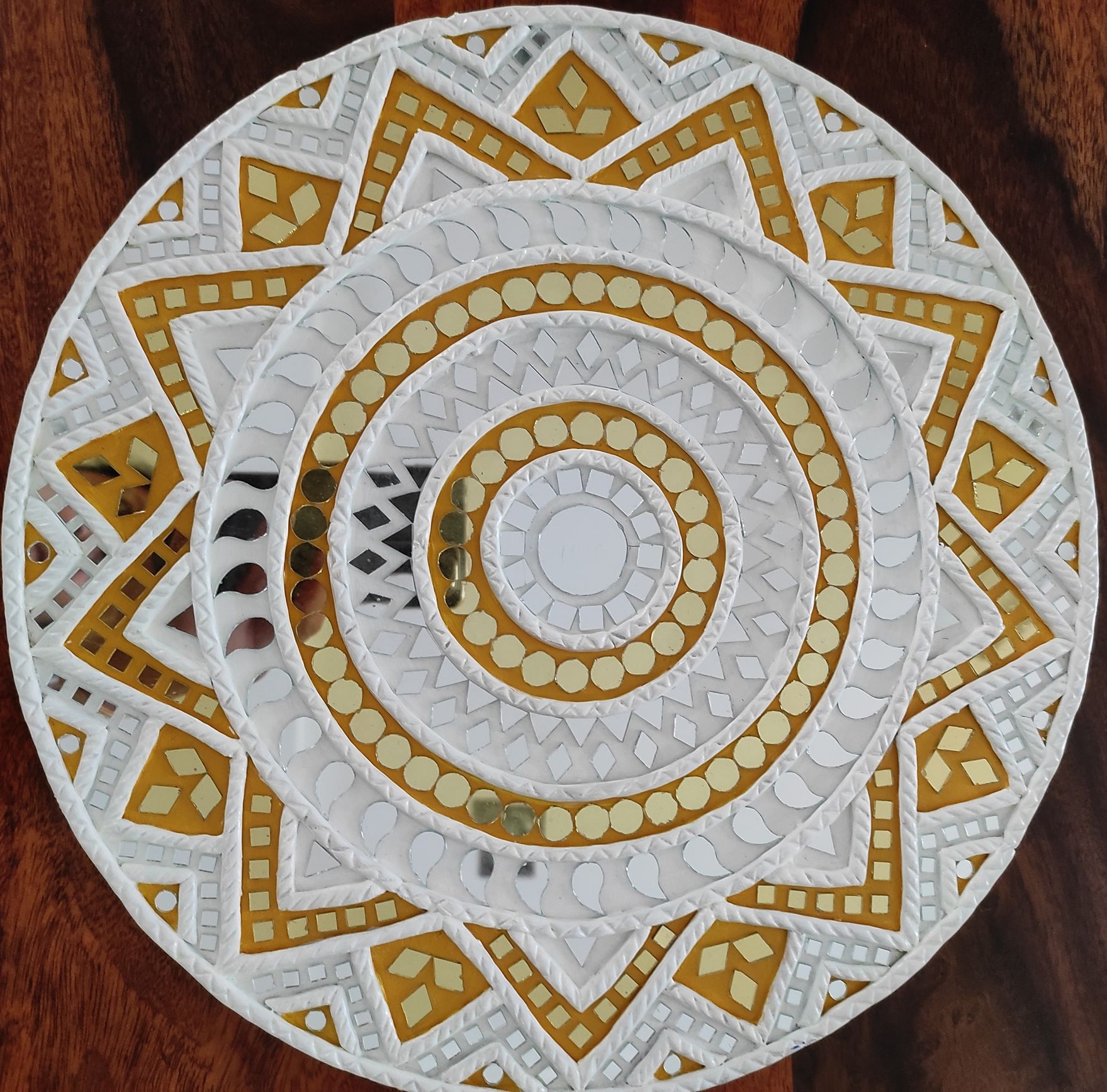 Created using the traditional Kutch Lippan technique, this artwork features layered circular patterns, intricate geometric detailing, and delicately placed mirror accents. The raised clay textures combined with subtle gold highlights create a calm yet regal presence, making it ideal for refined living spaces.