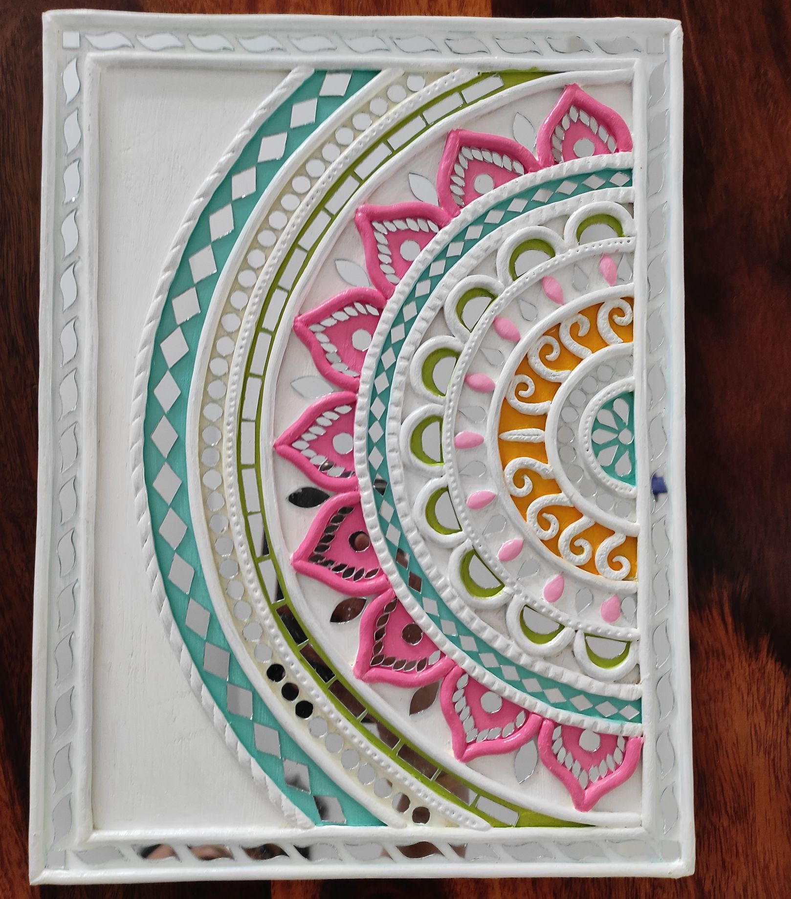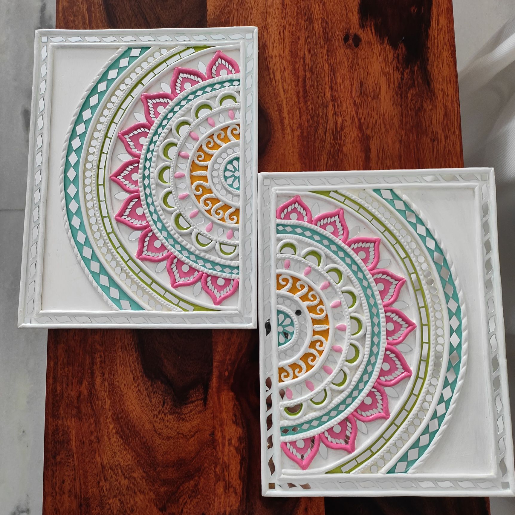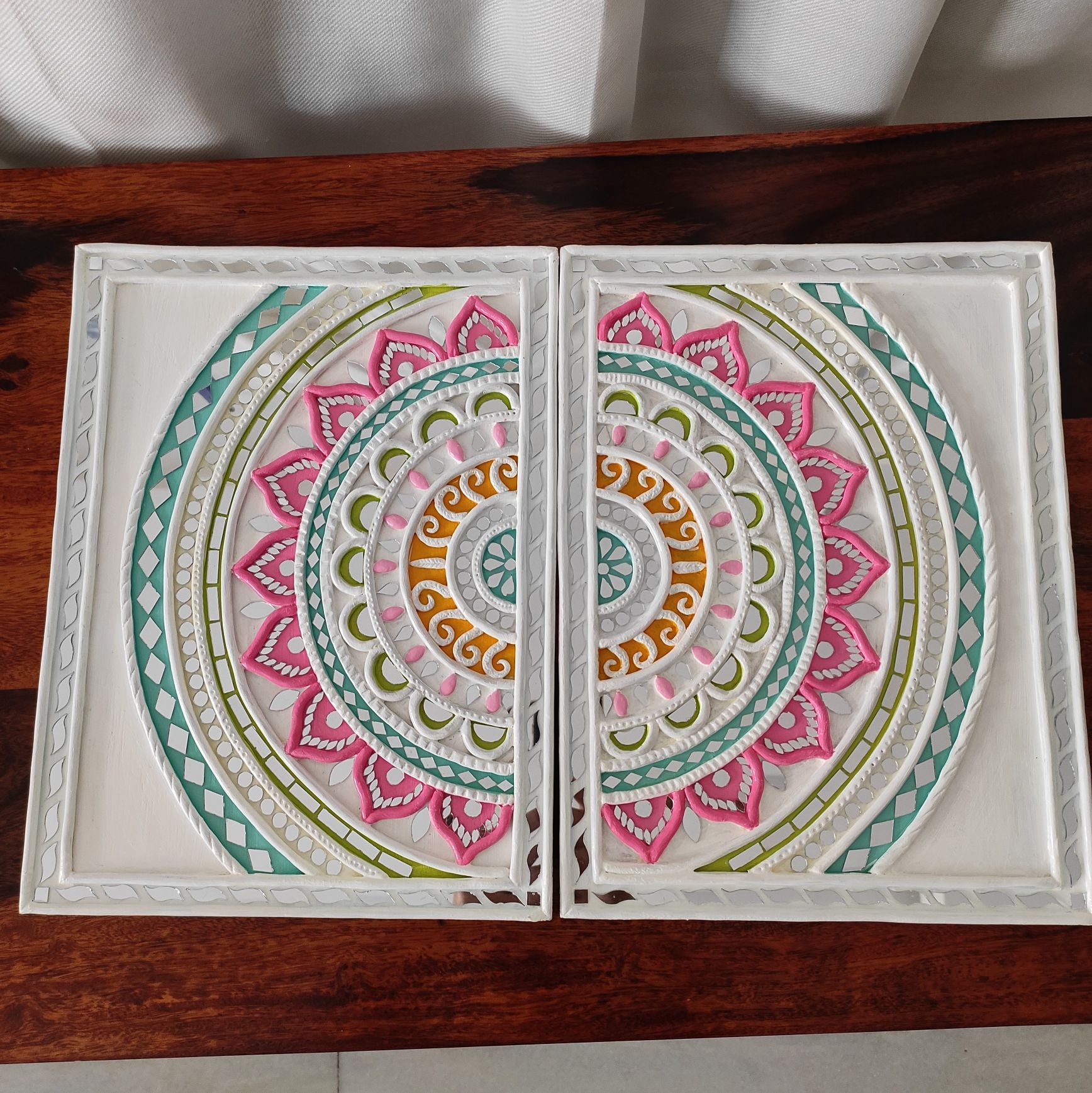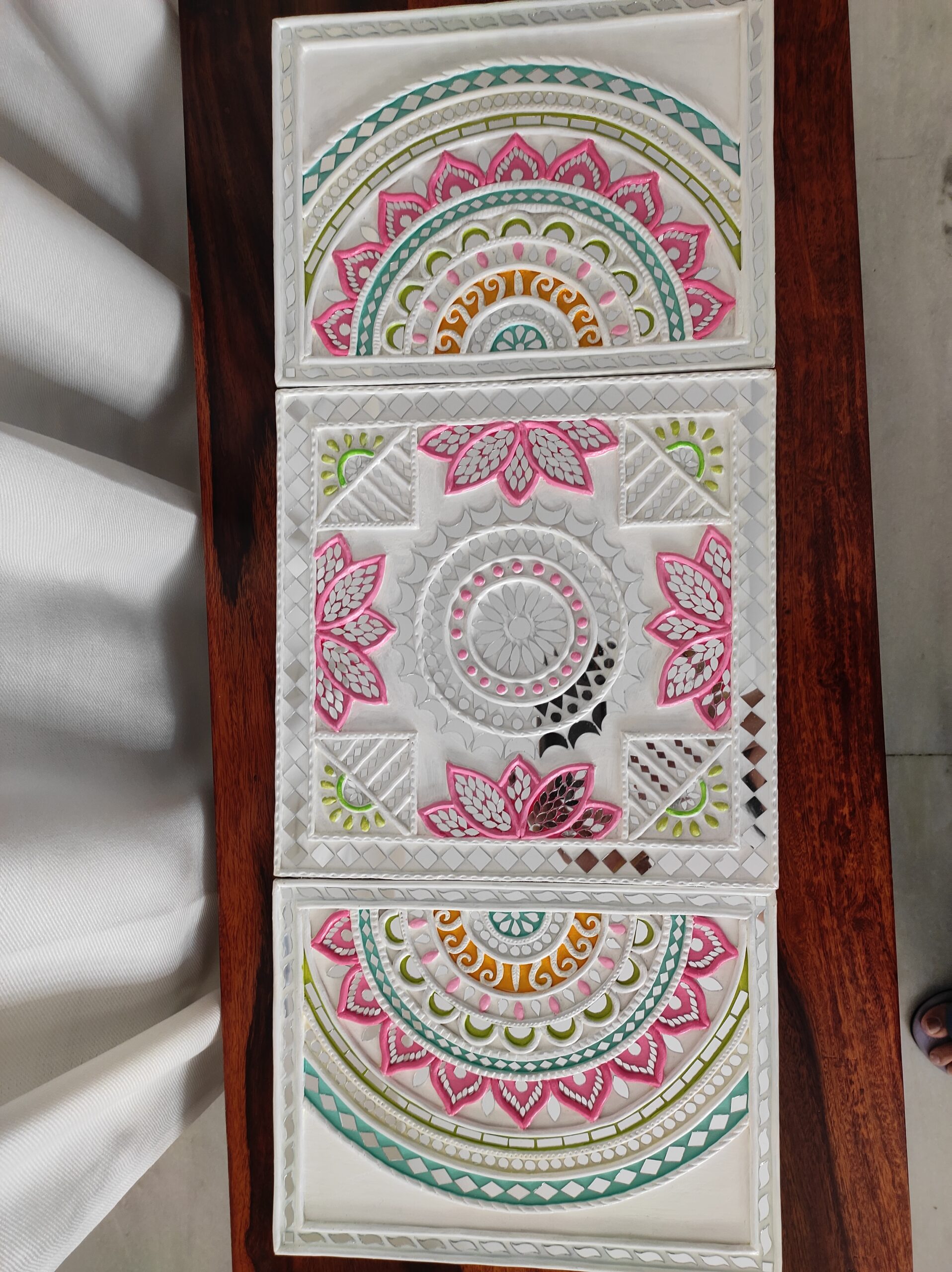 Crafted using the traditional Kutch Lippan technique, each panel features raised clay textures, intricate mandala patterns, and subtle mirror accents. Soft shades of white, pink, green, and earthy gold lend a calm, refined aesthetic that blends beautifully with both modern and ethnic interiors.