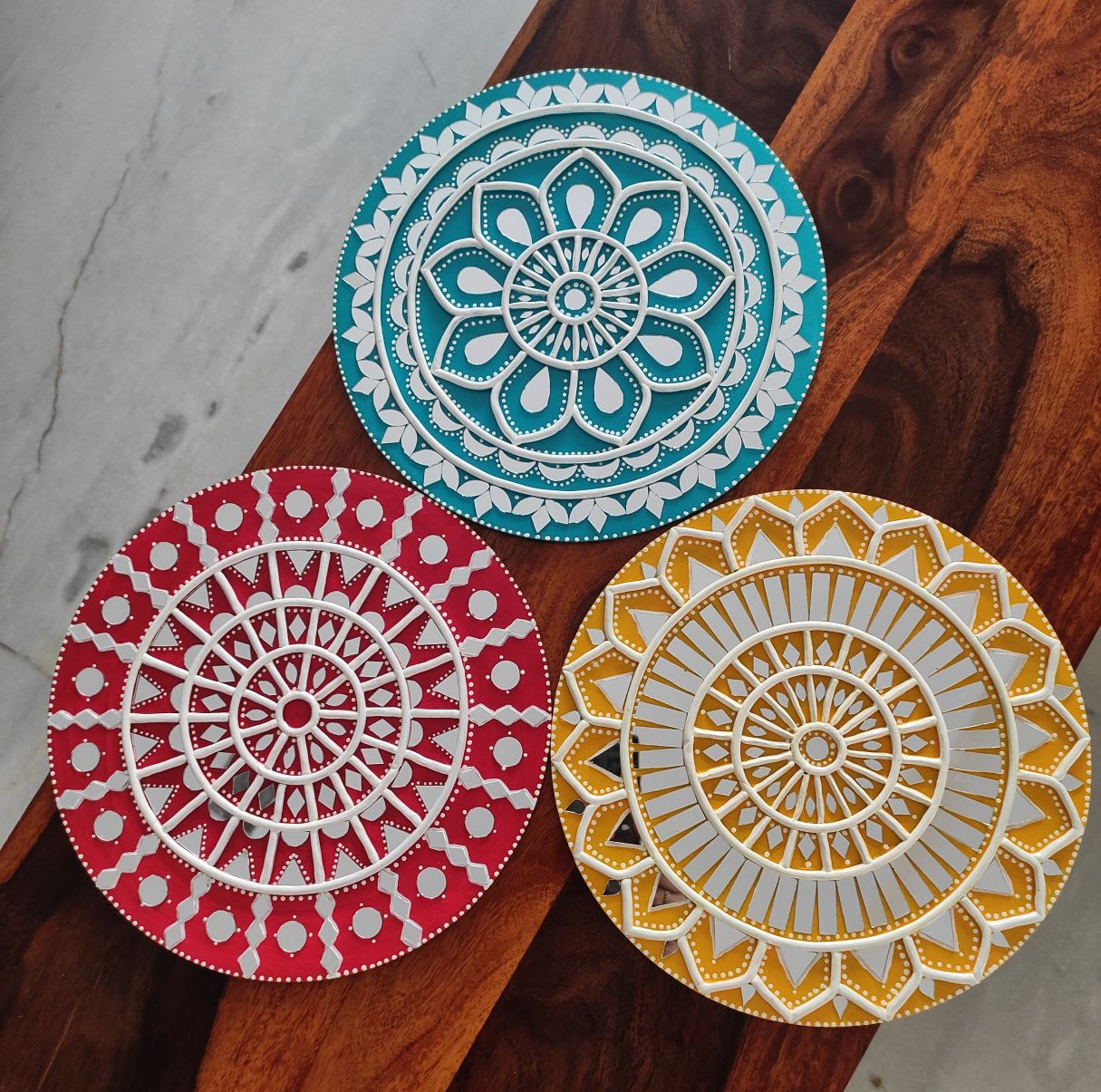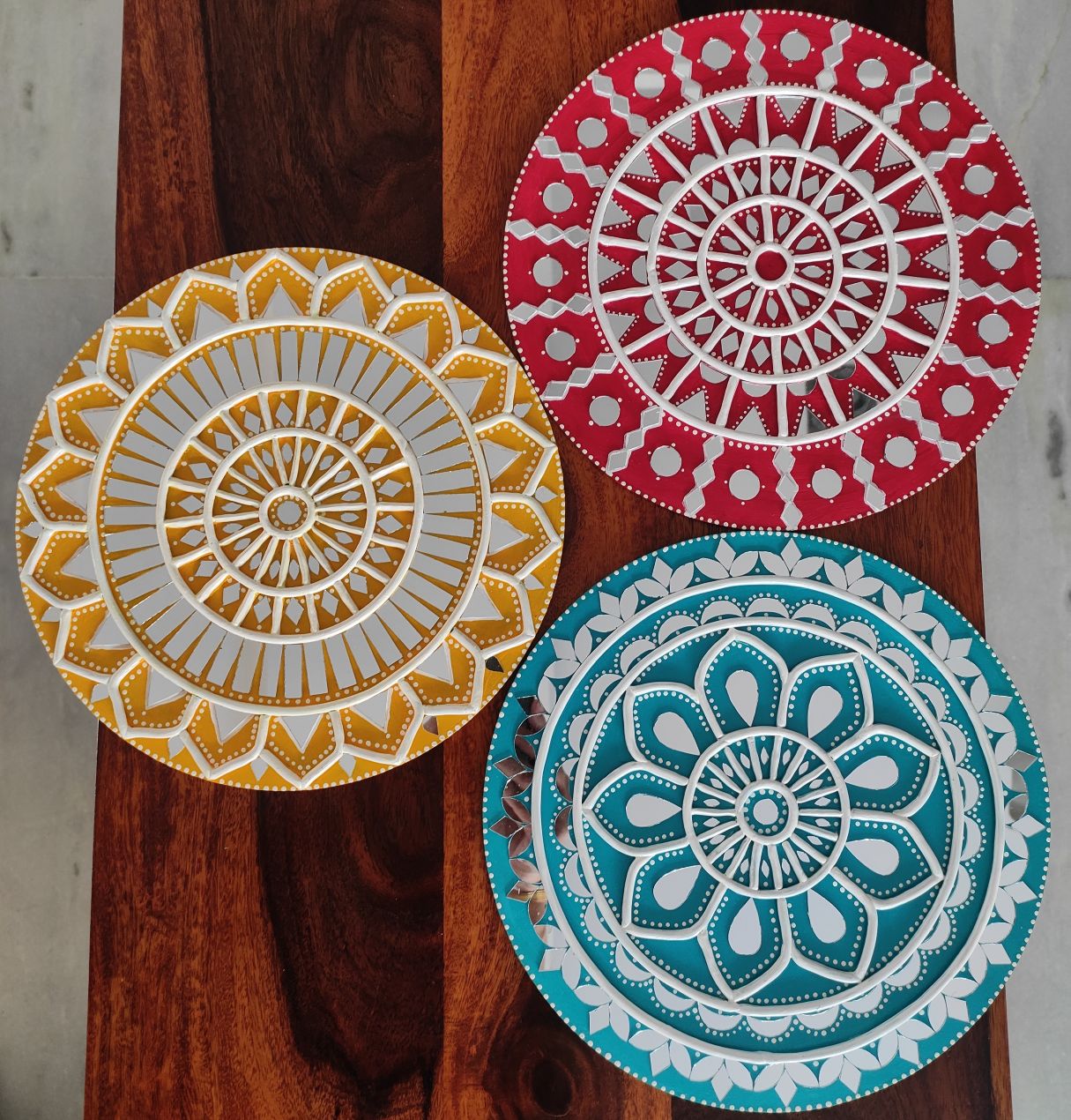 Created in striking shades of yellow, red, and teal, each circular piece showcases intricate raised clay patterns inspired by traditional mud and mirror artistry. The layered geometric and floral motifs create depth, symmetry, and visual harmony, while the bold color palette brings energy and elegance to your space. Each design stands out individually yet complements the others perfectly when displayed together as a coordinated wall arrangement.