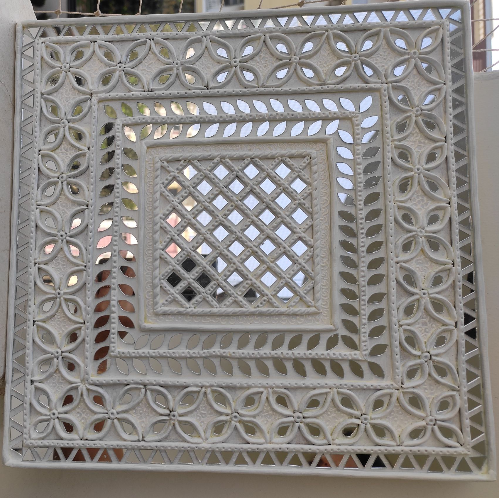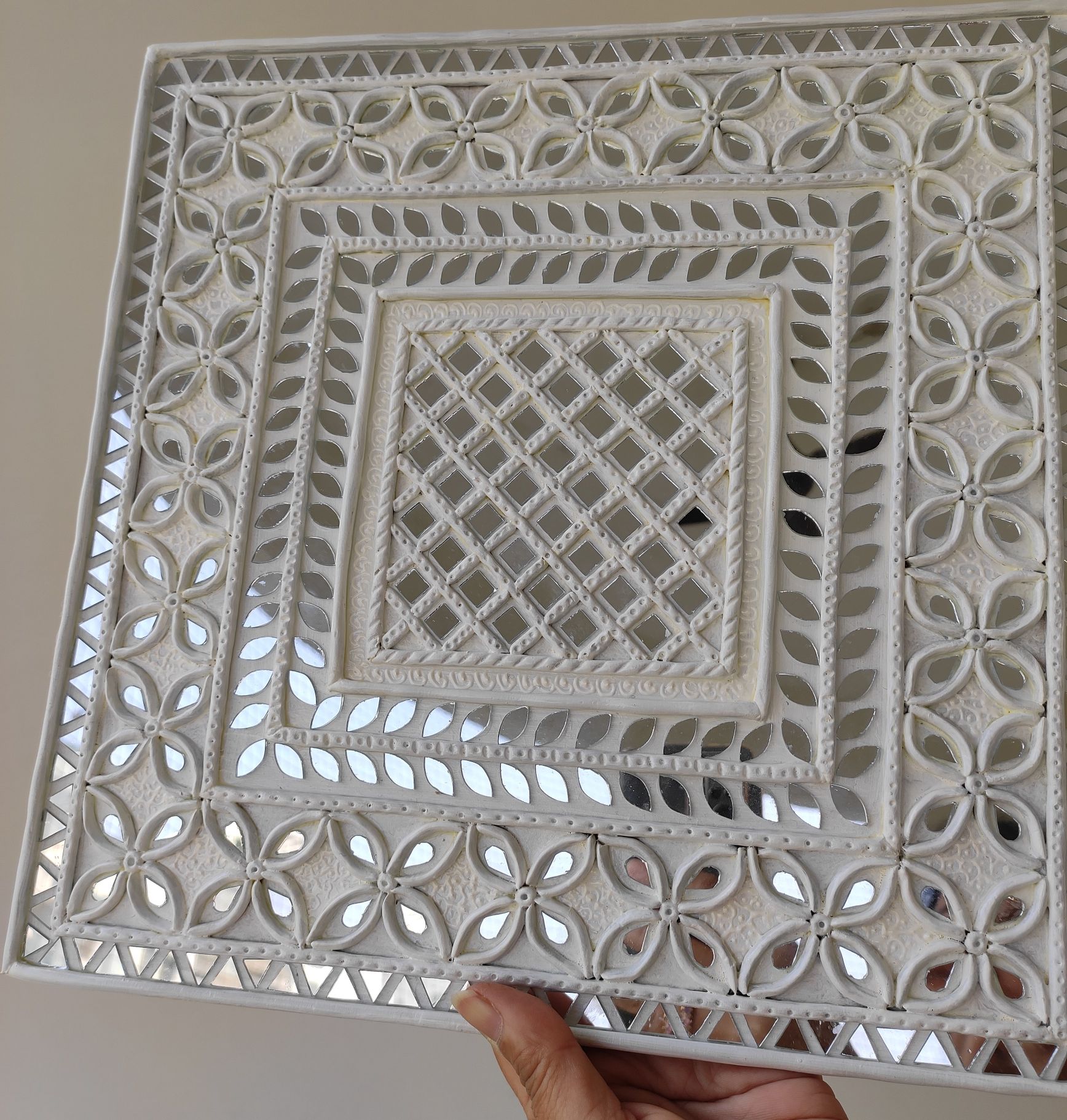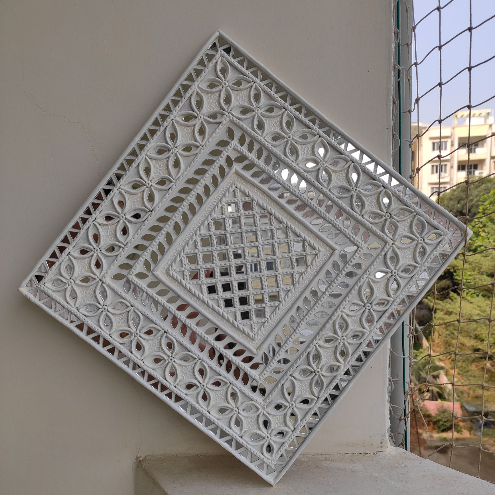 The artwork features layered geometric patterns, floral motifs, and lattice mirror work, all sculpted in raised clay and finished in an elegant white palette. Subtle mirror inlays reflect light softly, creating depth without overpowering the space.