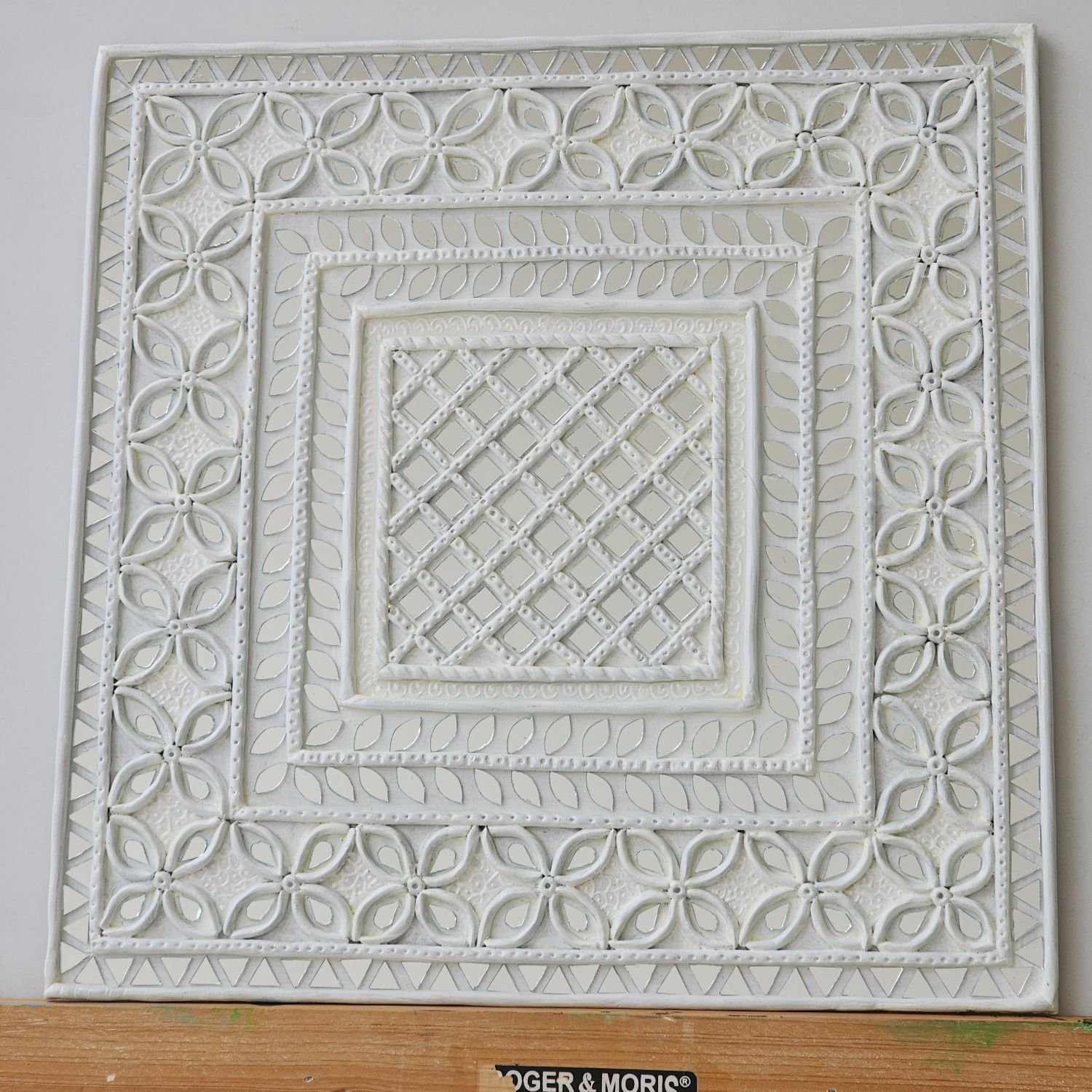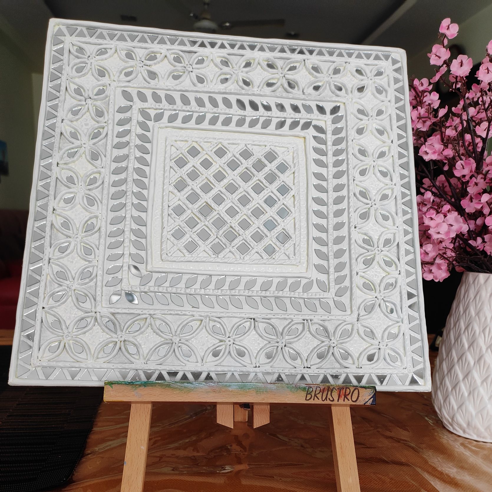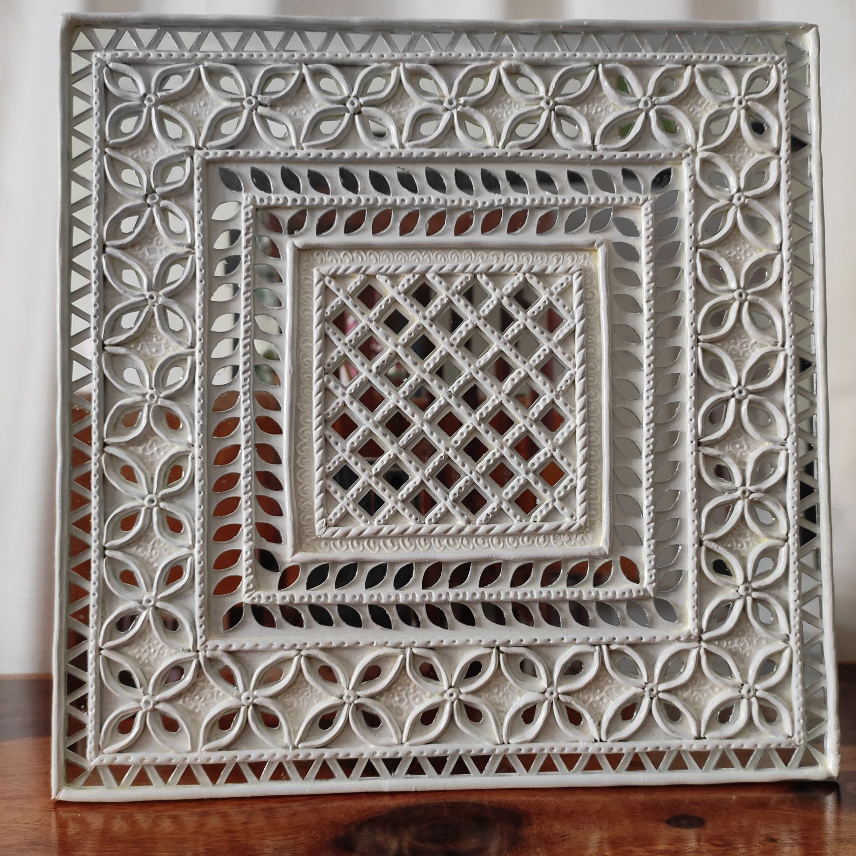The artwork features layered geometric patterns, floral motifs, and lattice mirror work, all sculpted in raised clay and finished in an elegant white palette. Subtle mirror inlays reflect light softly, creating depth without overpowering the space.