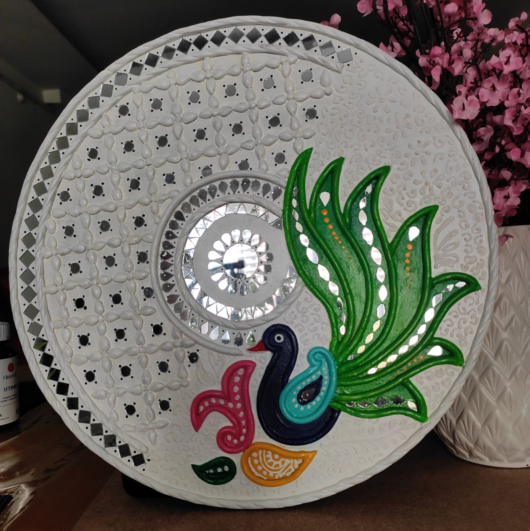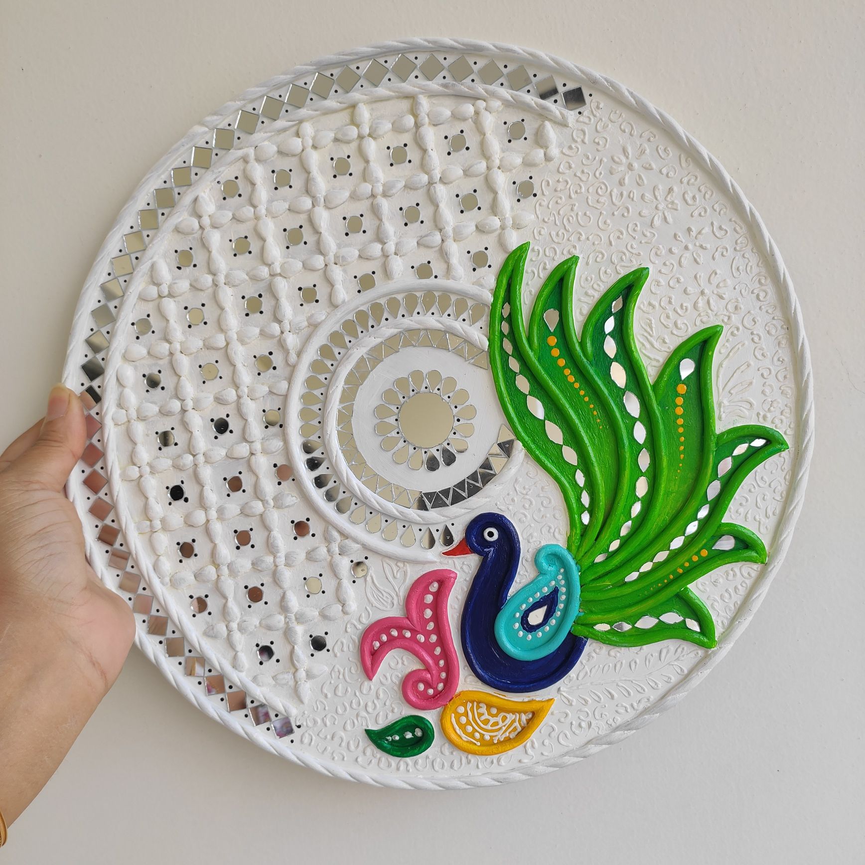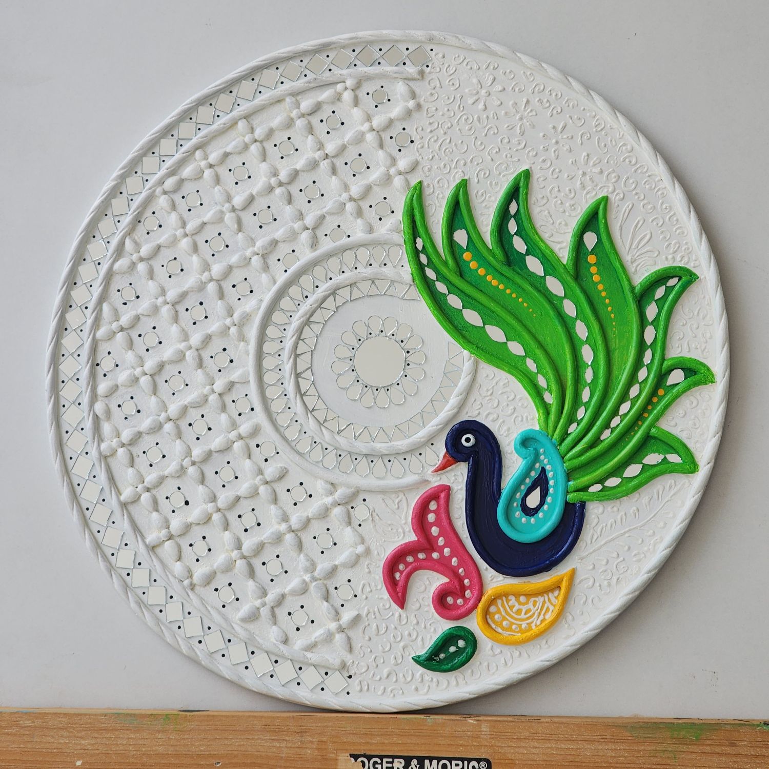 Celebrate traditional craftsmanship with this handcrafted Lippan Art wall decor featuring a graceful peacock design. Set against a beautifully textured white base, the artwork combines intricate mud patterns with subtle mirror detailing at the center. The vibrant peacock, highlighted in deep blue, bright green, and accent colors, adds a lively contrast to the minimal background.
