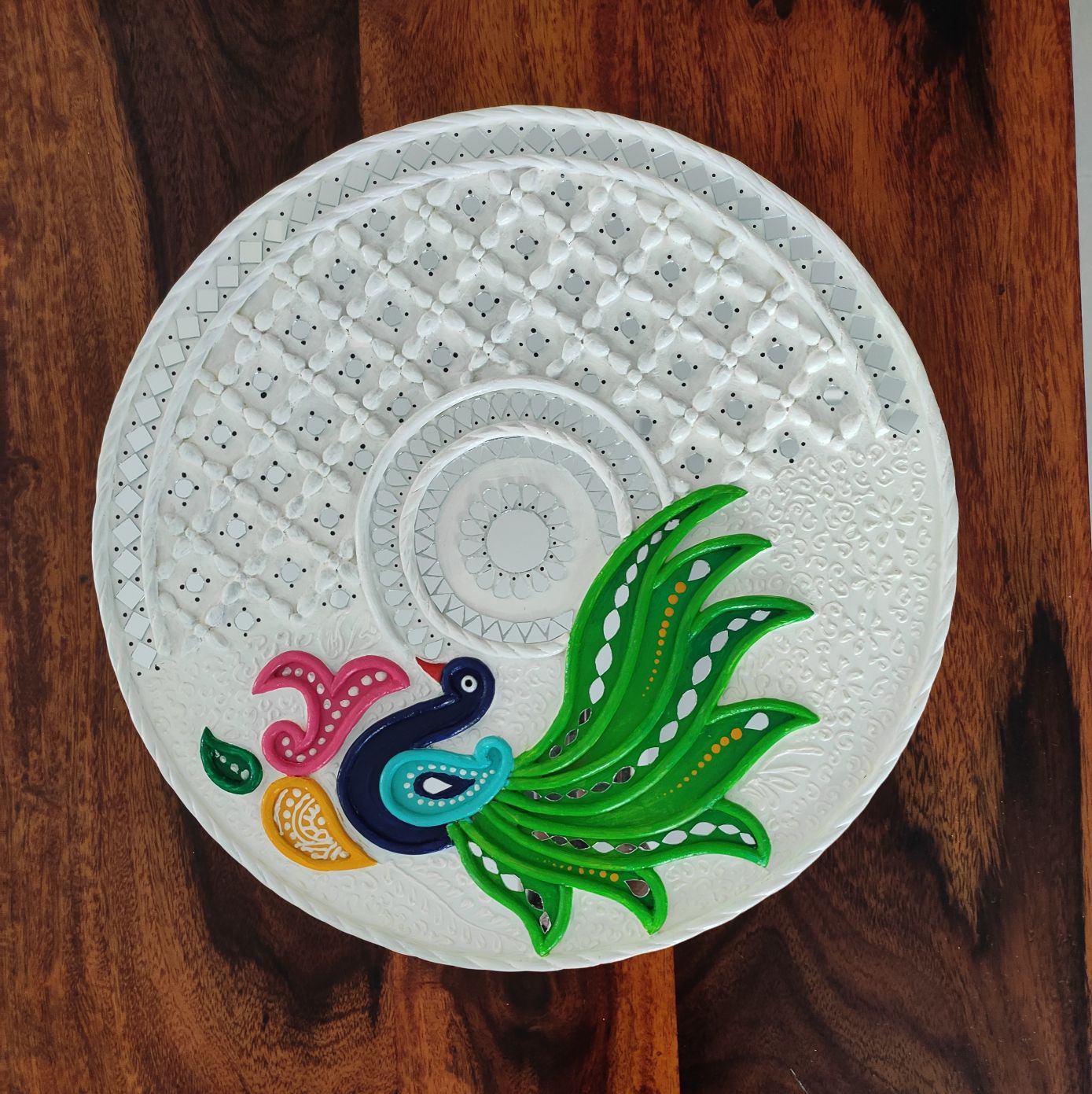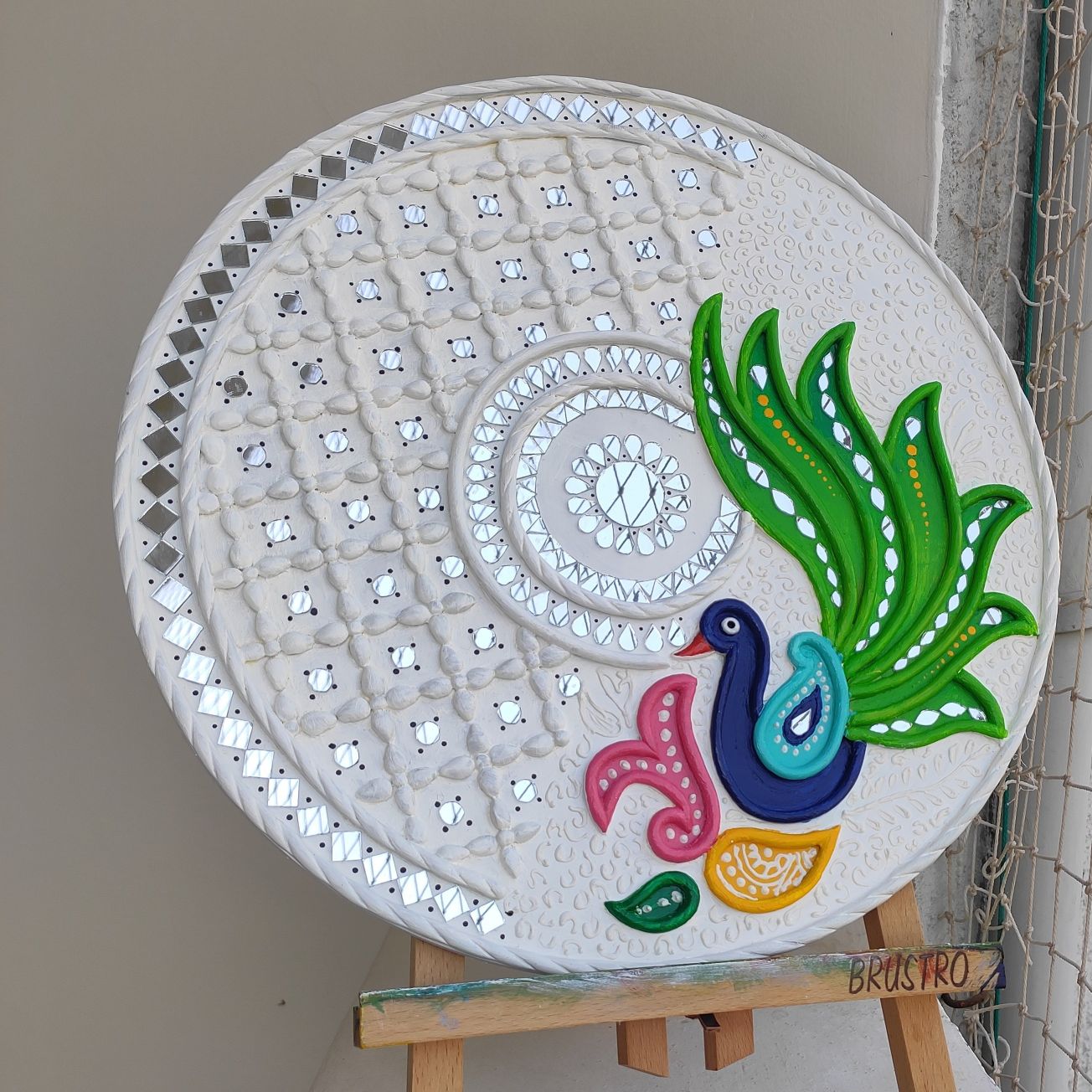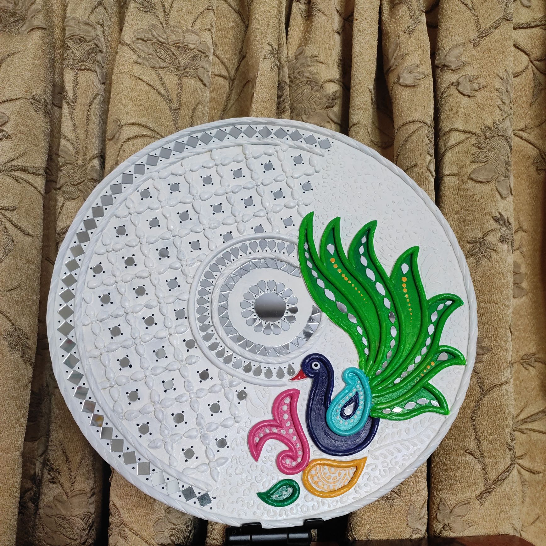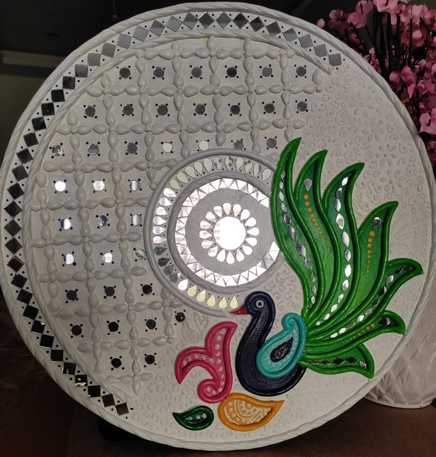Celebrate traditional craftsmanship with this handcrafted Lippan Art wall decor featuring a graceful peacock design. Set against a beautifully textured white base, the artwork combines intricate mud patterns with subtle mirror detailing at the center. The vibrant peacock, highlighted in deep blue, bright green, and accent colors, adds a lively contrast to the minimal background.